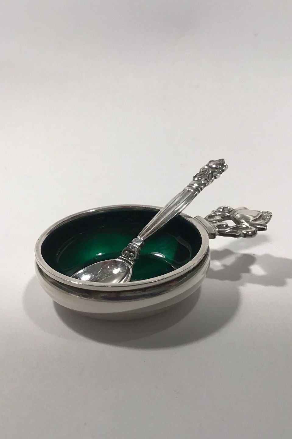 Georg Jensen Sterling Silver Acorn Saltcellar No 62 (Green enamel) and Salt Spoon Measures 4.1 cm(1 39/64 in) Spoon 6 cm(2 23/64 in)