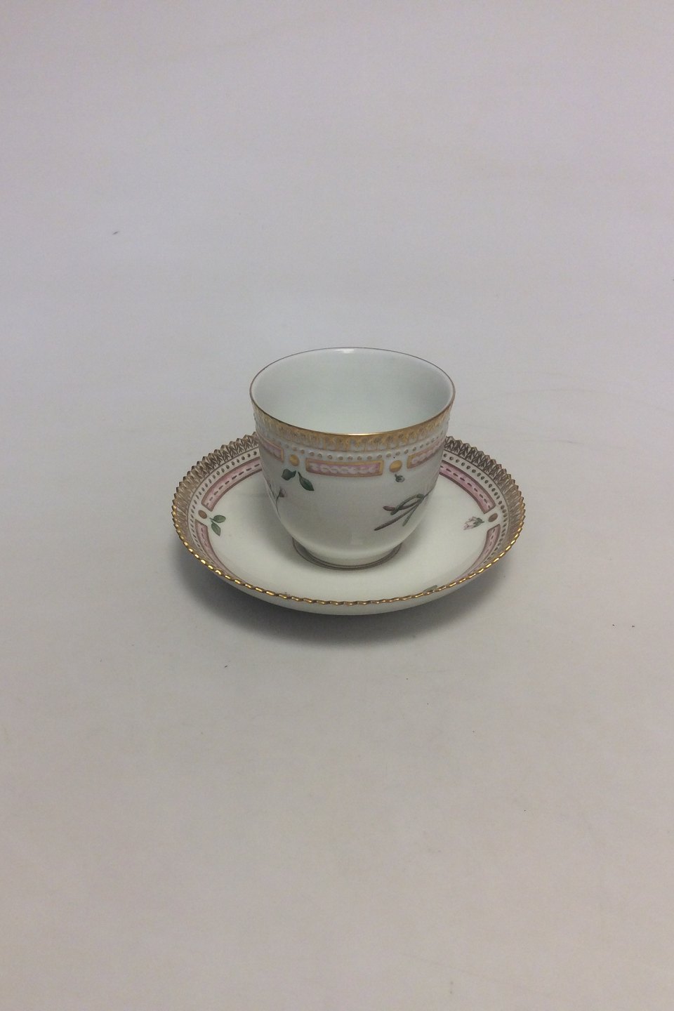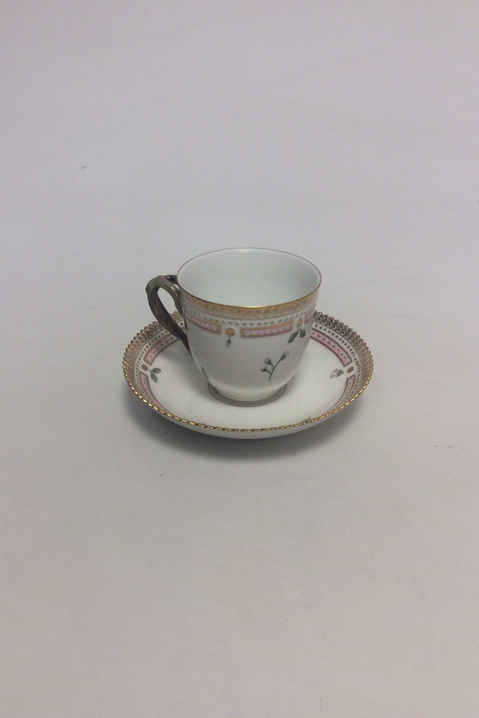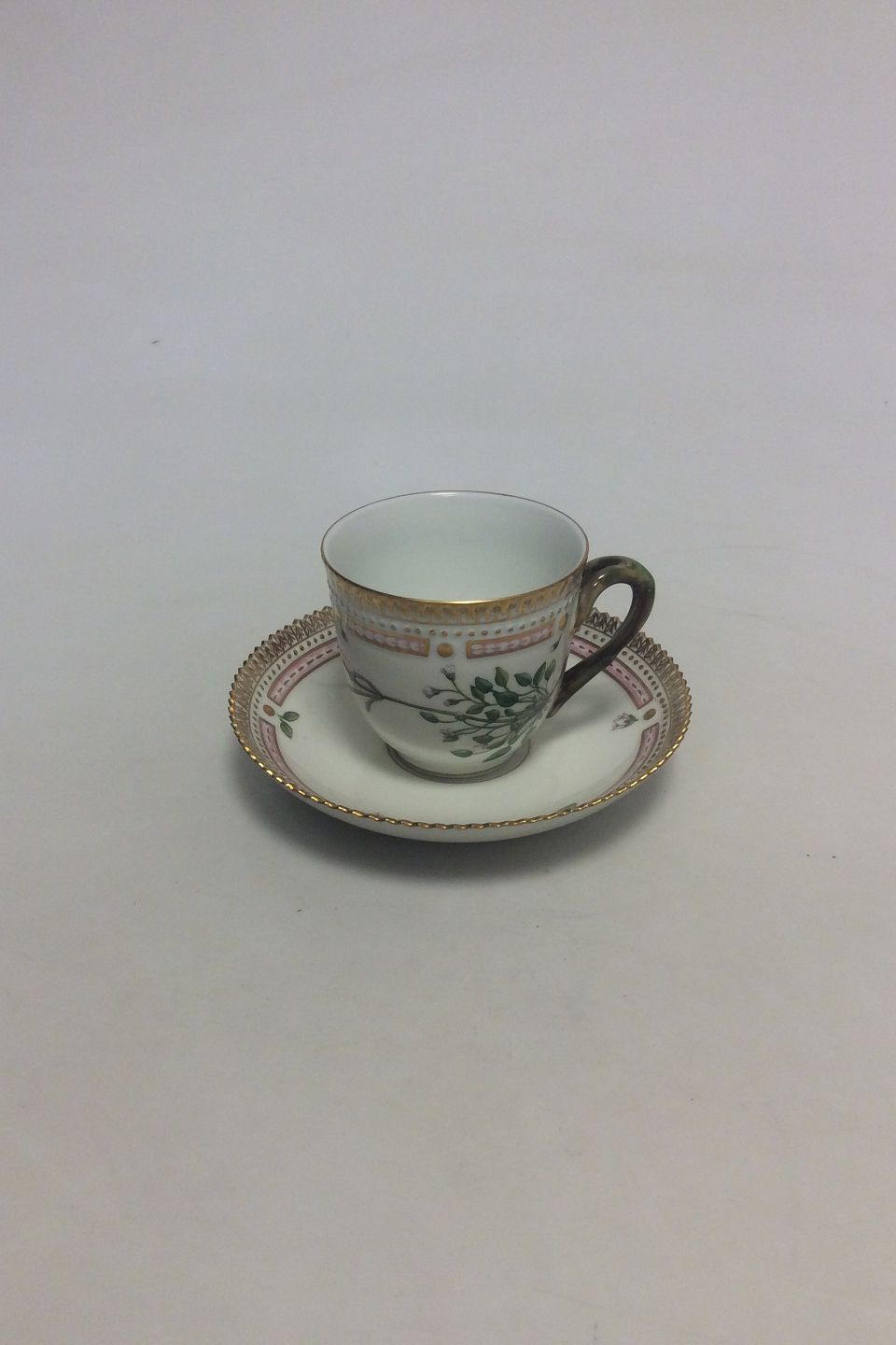 Royal Copenhagen Flora Danica Kaffekop og Underkop No 20/3597. Latinsk Navn: Carolamine Bellidifolia L Måler Kop: 7 cm x 7,5 cm dia. Underkop: 13,8 cm