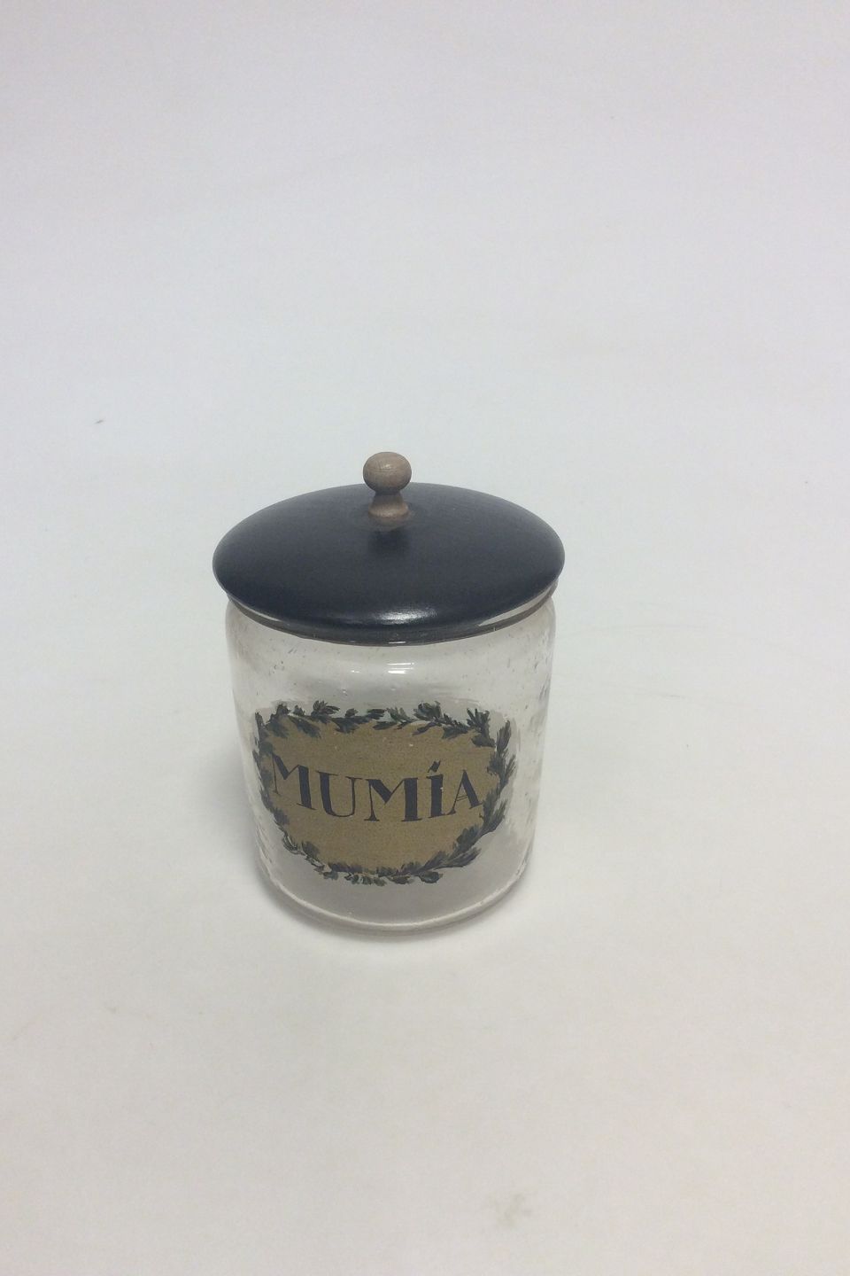 Holmegaard Pharmacy Jar with lid with the text "MUMIA" from 1987.