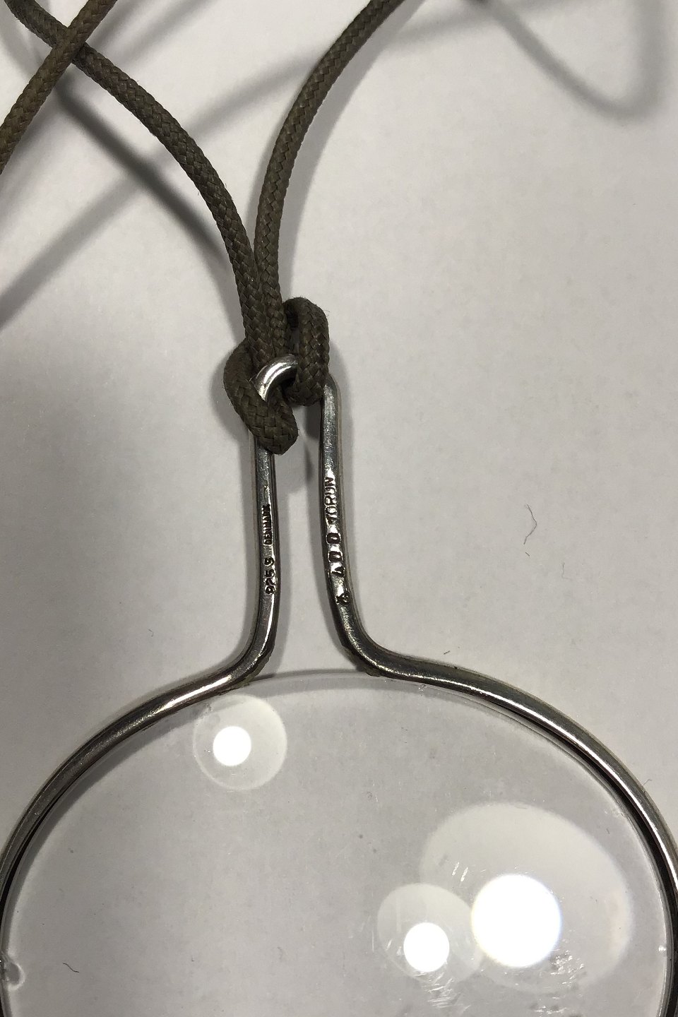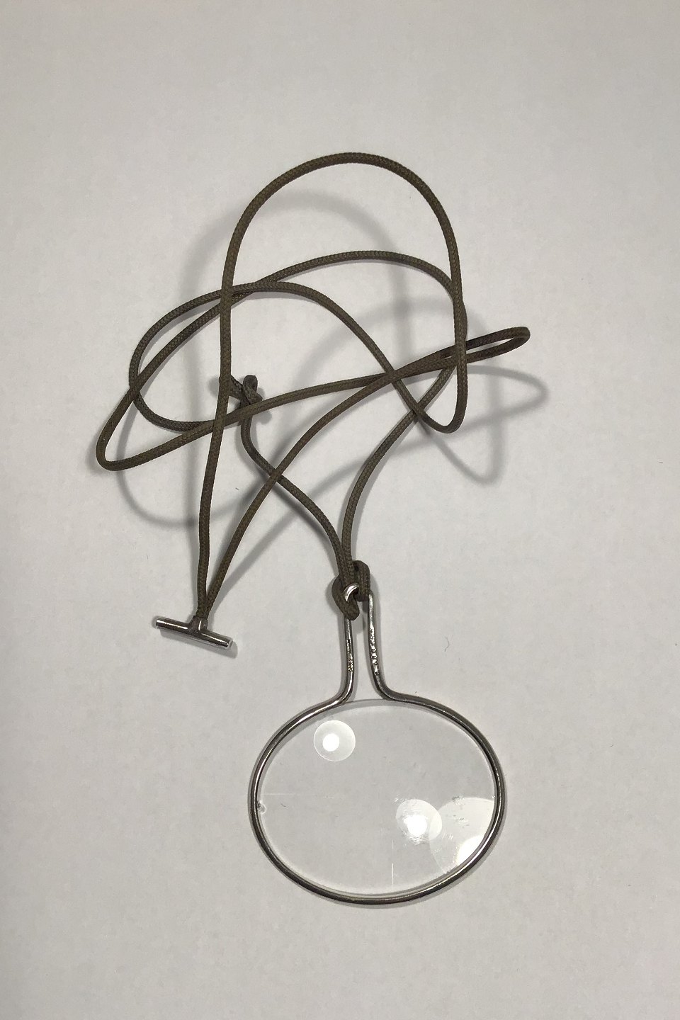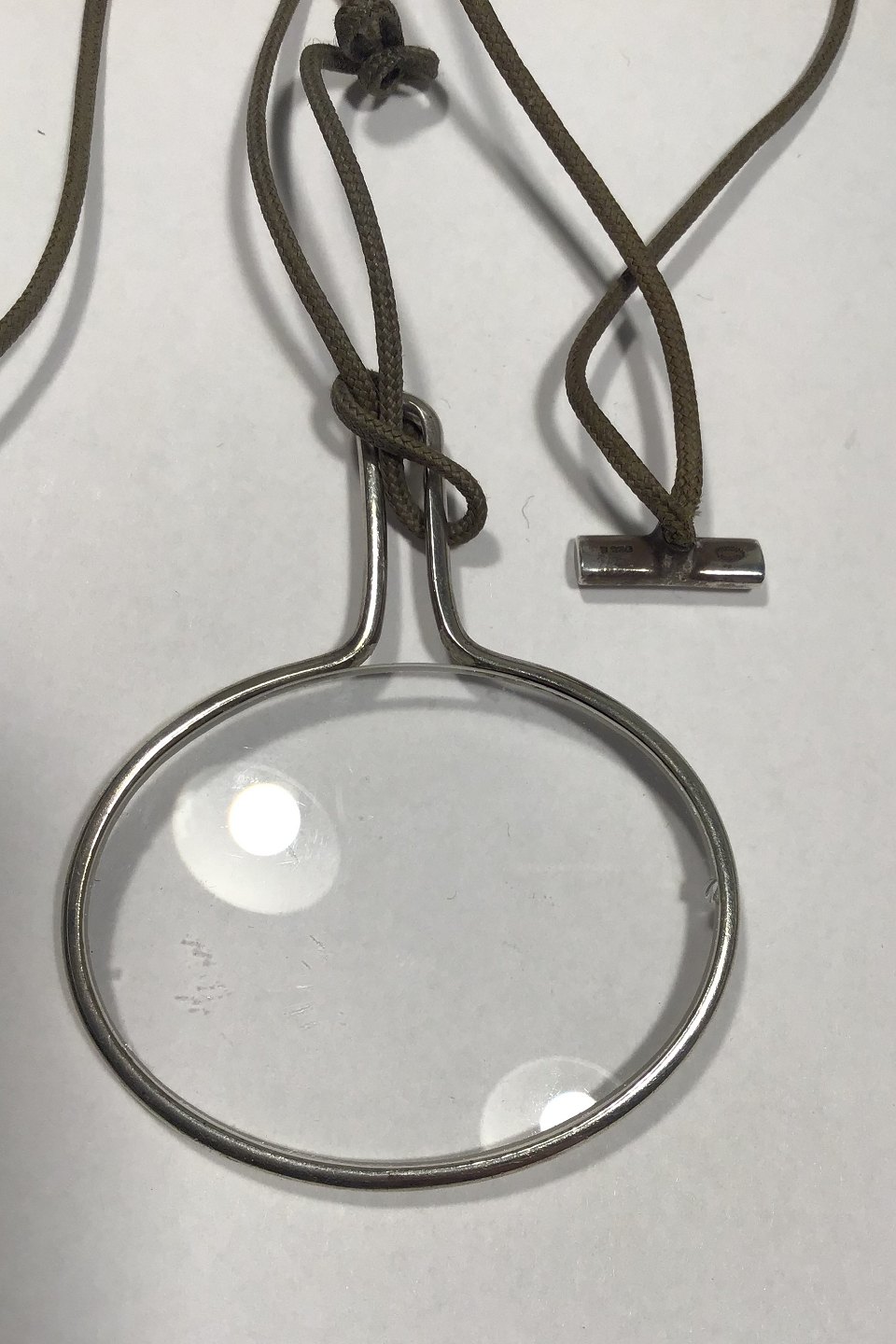 Georg Jensen String with Sterling Silver Pendant No 400 (Magnifying Glass) Torun Measures 76 cm (30 in) Magnifying glass 6 cm x 4.8 cm(2 23/64 in 1 57/64 in) Combined weight 14.6 gr/ 0.51 oz(Tiny chip)