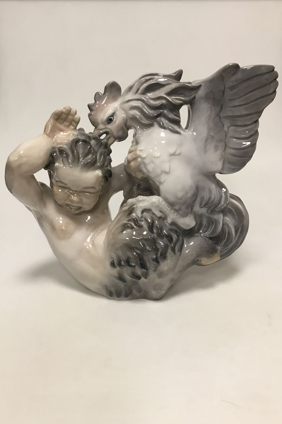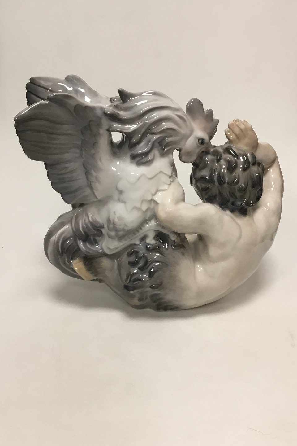 Royal Copenhagen Figur af Faun i kamp med en hane No 3083. Signeret KK for Knud Kyhn. Måler 30 cm x 32 cm. 1. Sortering og i rigtig flot stand.