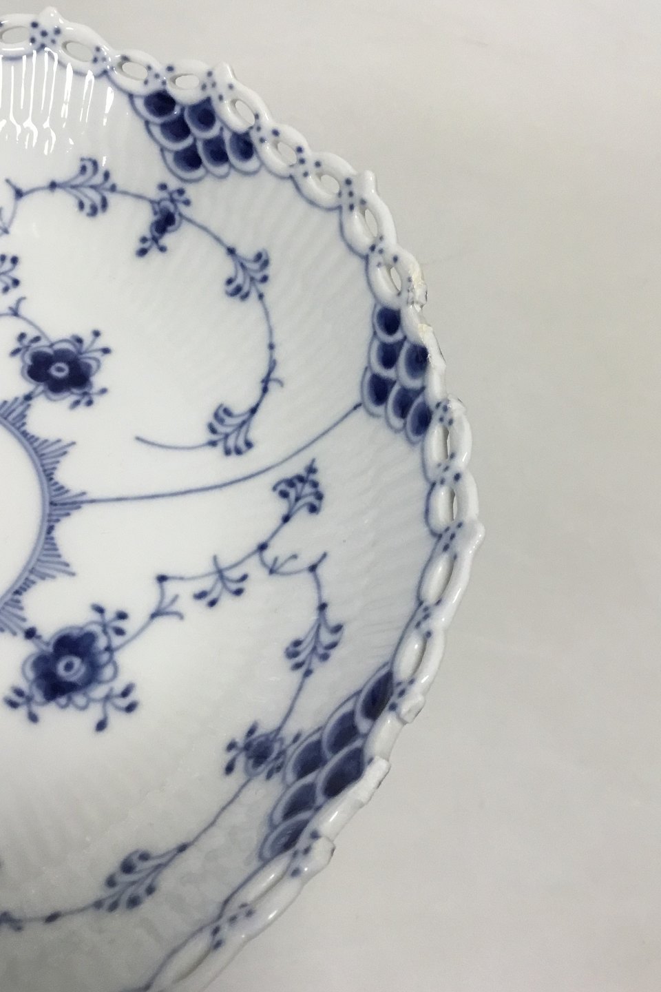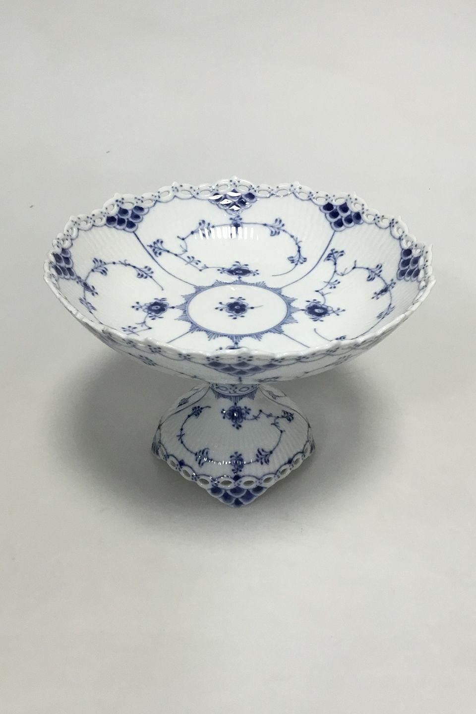Royal Copenhagen Musselmalet Helblonde Kageskål på Fod No 1020. Måler 14,5 cm x 20,5 cm. Afslag på kanten.