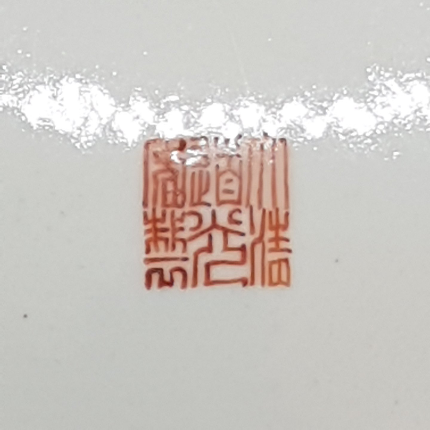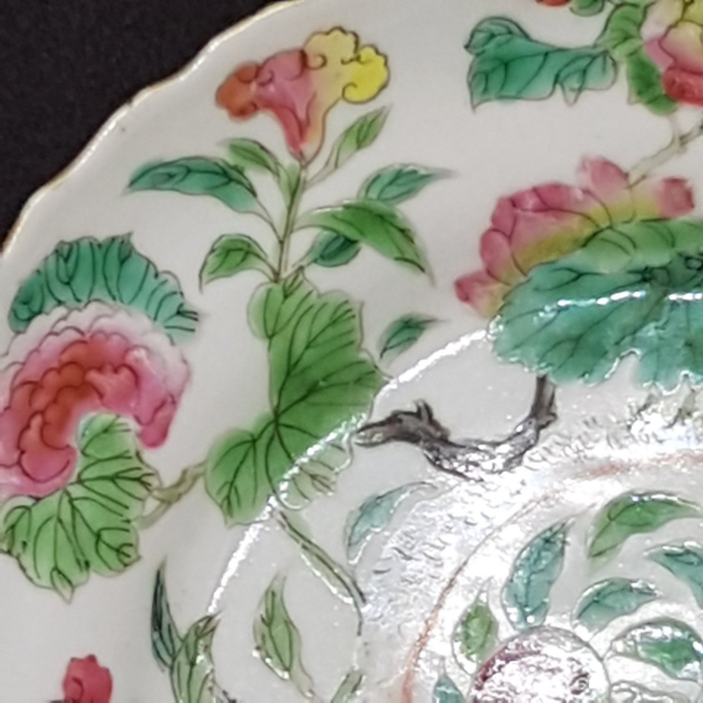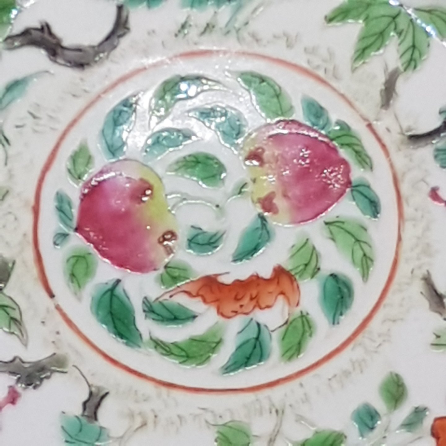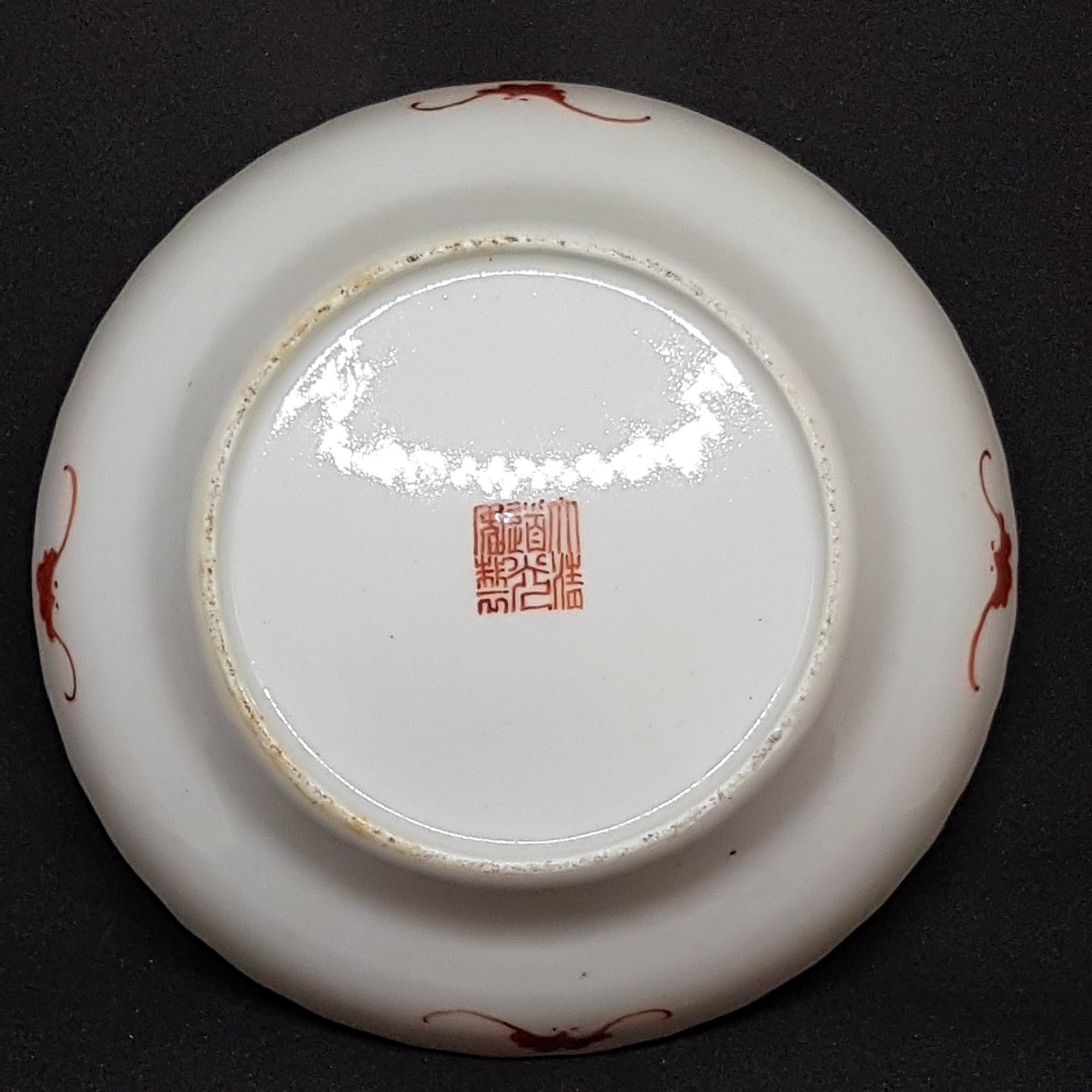 Kinesisk famille rose porcelænstallerken med Daoguang (1820-1850) mærke og fra perioden. Flot dekoreret med ferskner og flagermus i centrum, samt blomster og blade rundt om. Bagside med flagermus og periodemærke. Svejfet kant med guldbemaling. Mindre brændingsfejl på kant. Diameter 13,5 cm.