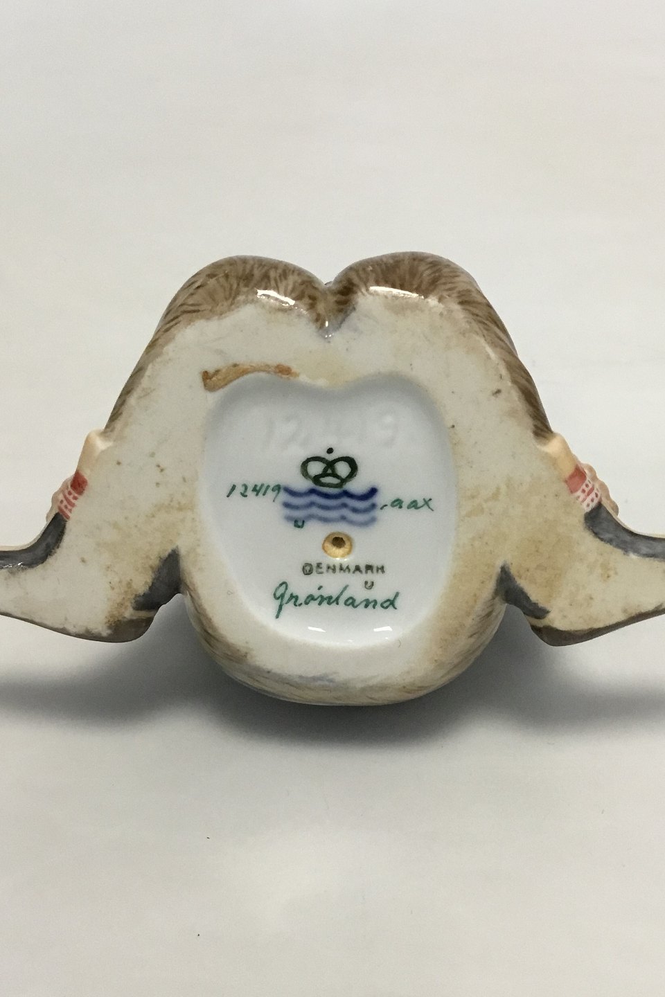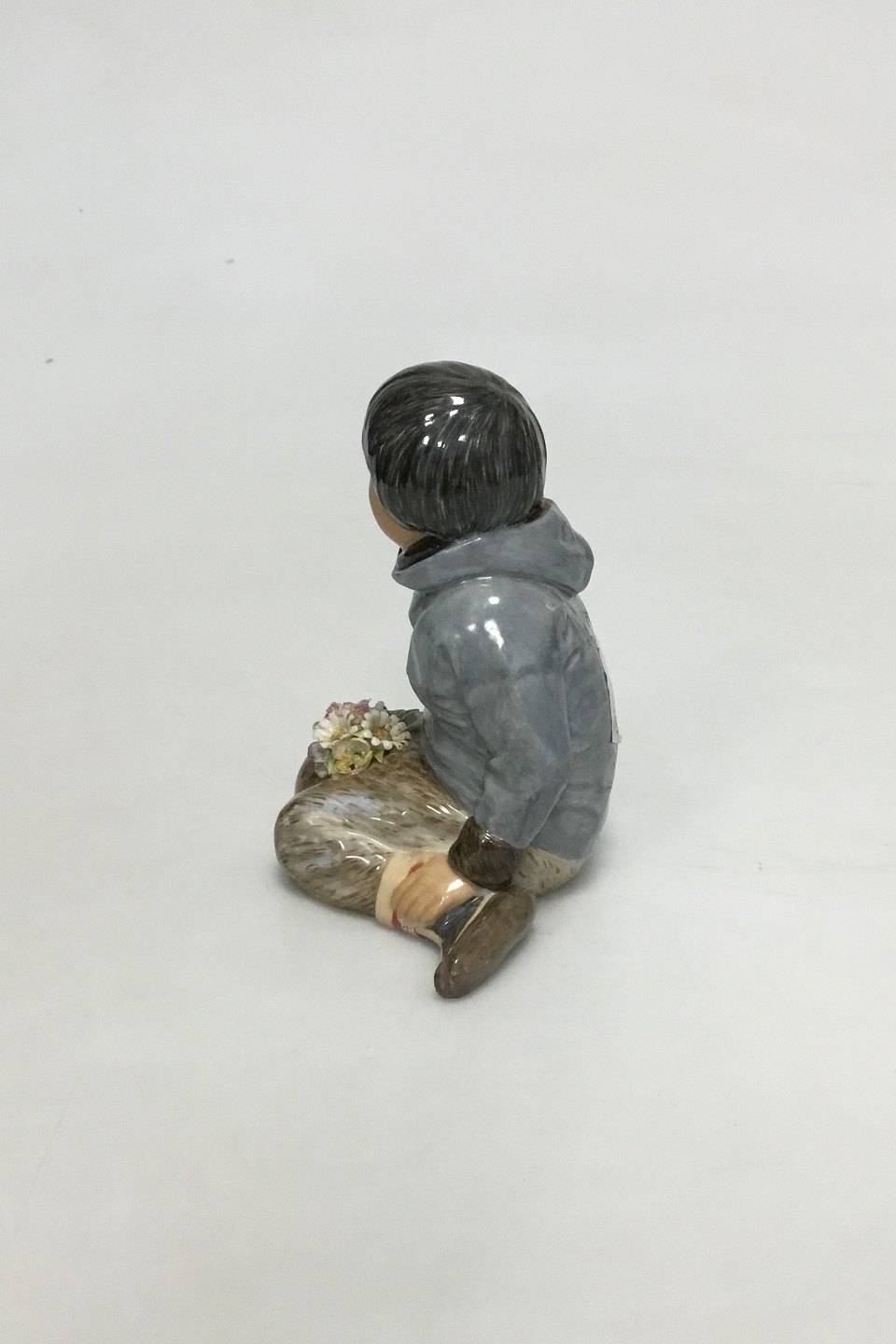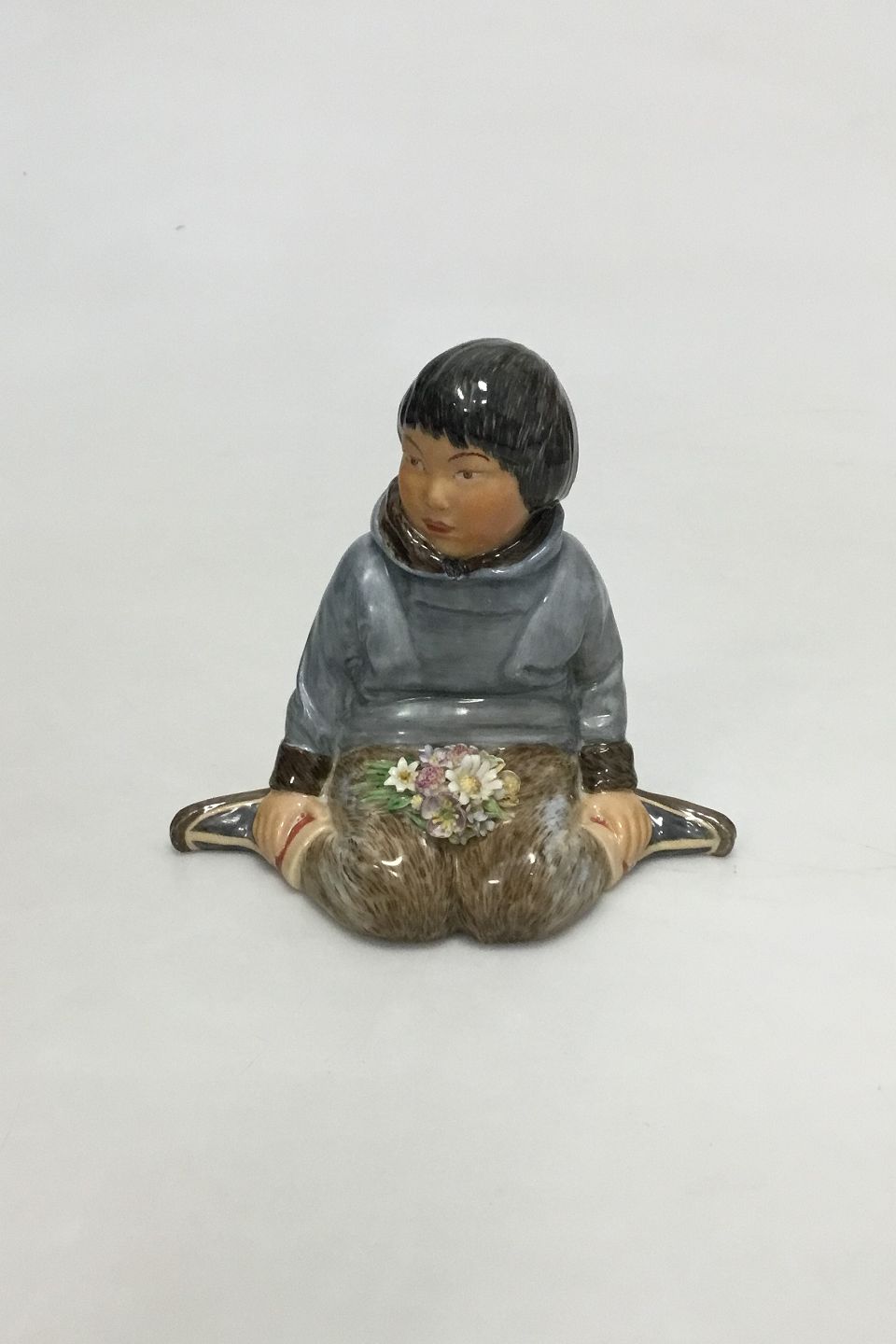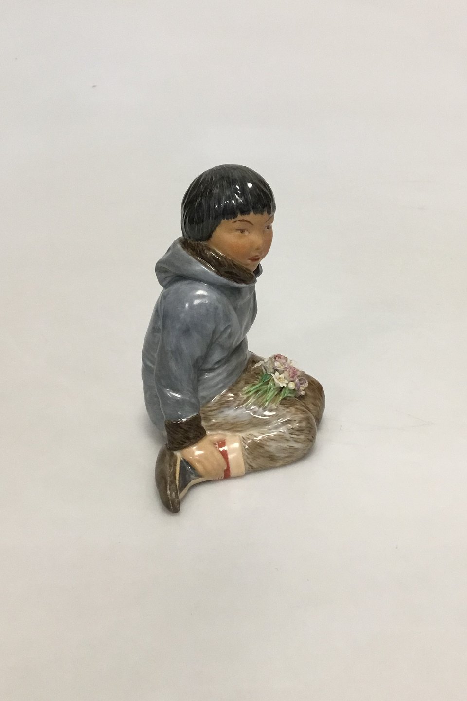 Royal Copenhagen overglaze regional figurine of boy with flowers "Grønland" = "Greenland" No 12419. Measures 9.5 cm /3 47/64 in. Minor chips on flowers