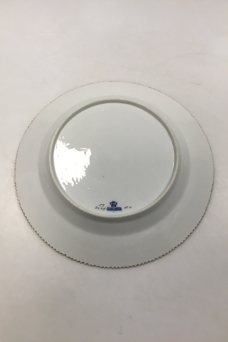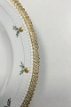 Middagstallerken No 17/3549. Dekoreret med frugter i overglasur og guldkant. Måler 25cm (9 27/32 in.) 2.Sortering med skår i guldkanten.