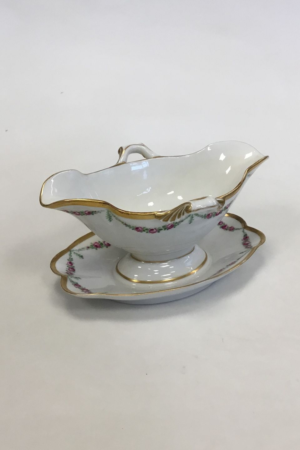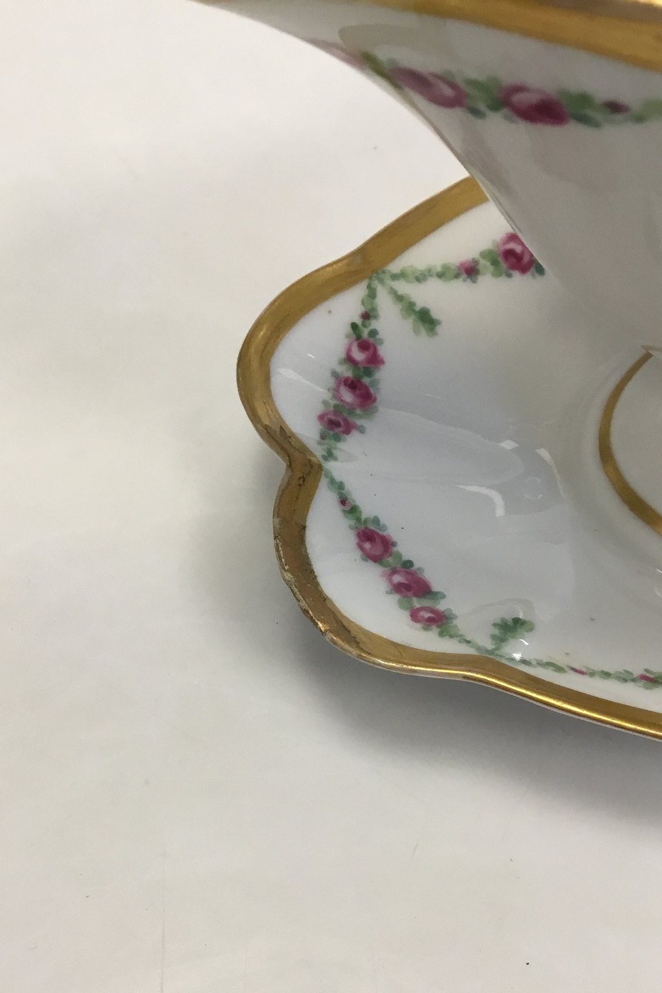 Royal Copenhagen Pattern No 478 Rose Garlands with gold Sauce Boat No 448. Measures 20 cm / 7 7/8 in. Repairs on edge