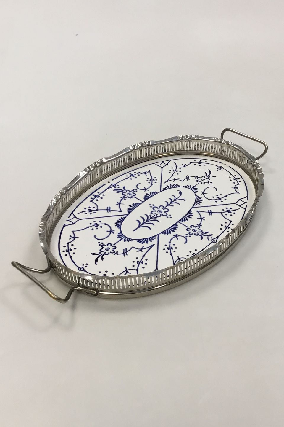 Bayerische Metall Fabrik BMF Tyskland, Bakke af blåmalet porcelæn med metalkant. Måler 25 cm(9 27/32 in.)