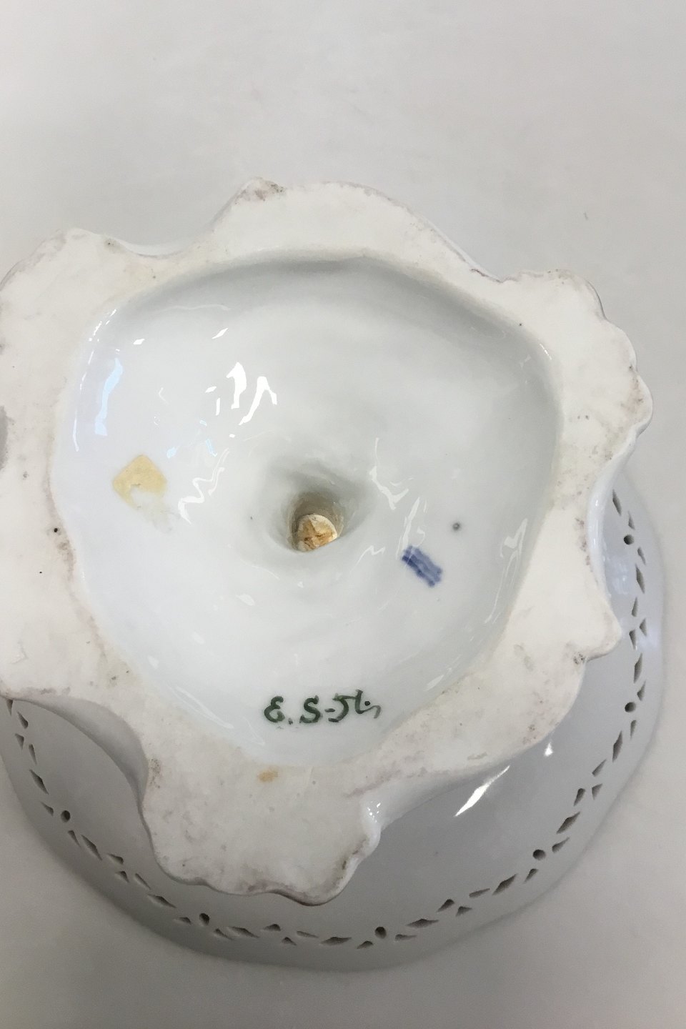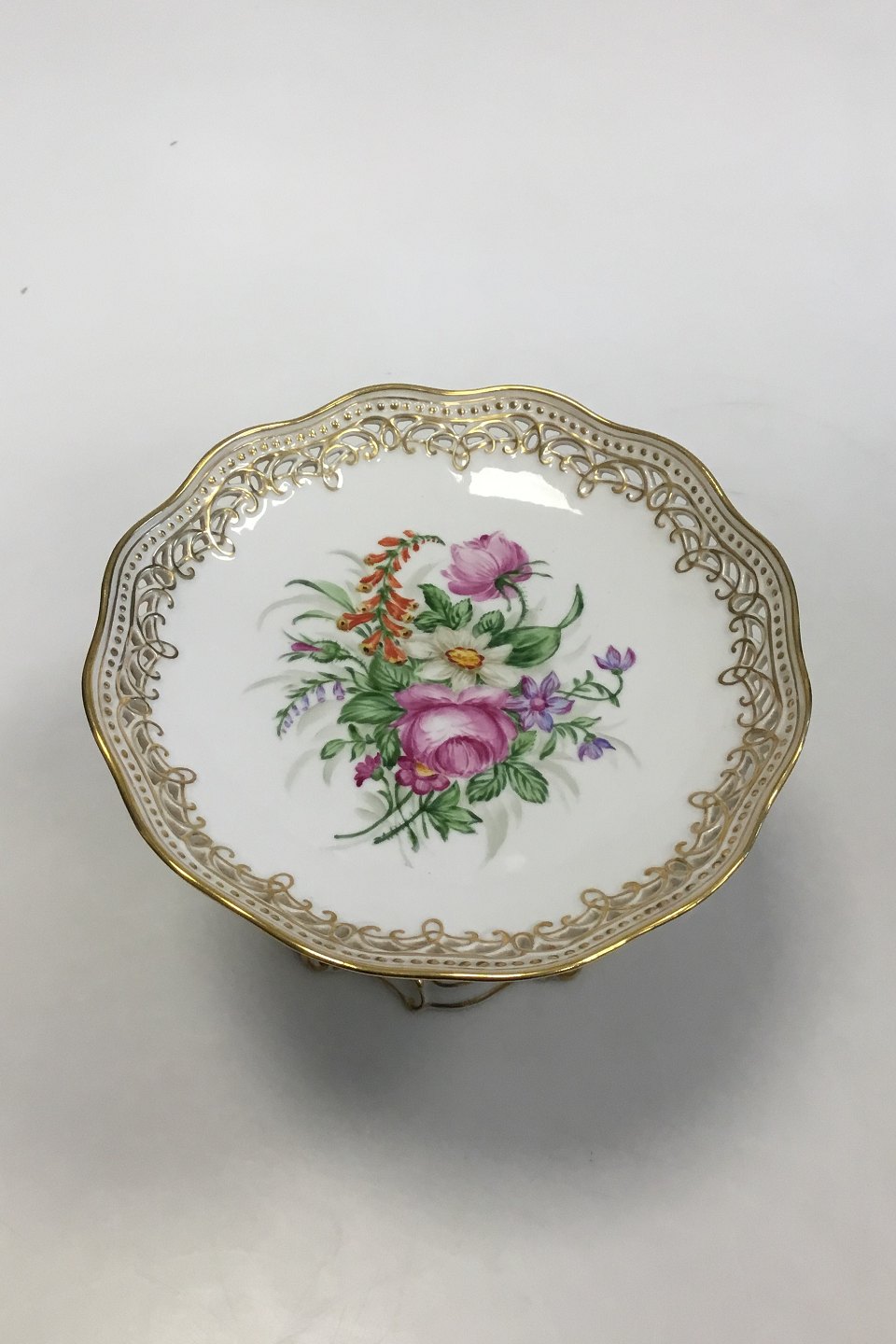 Royal Copenhagen Flora Danica Pedistal Bowl with flowerdecoration and Putti with dove. Measures 15.5 cm / 6 7/64 in. high and 20.5cm / 8 5/64 in. dia