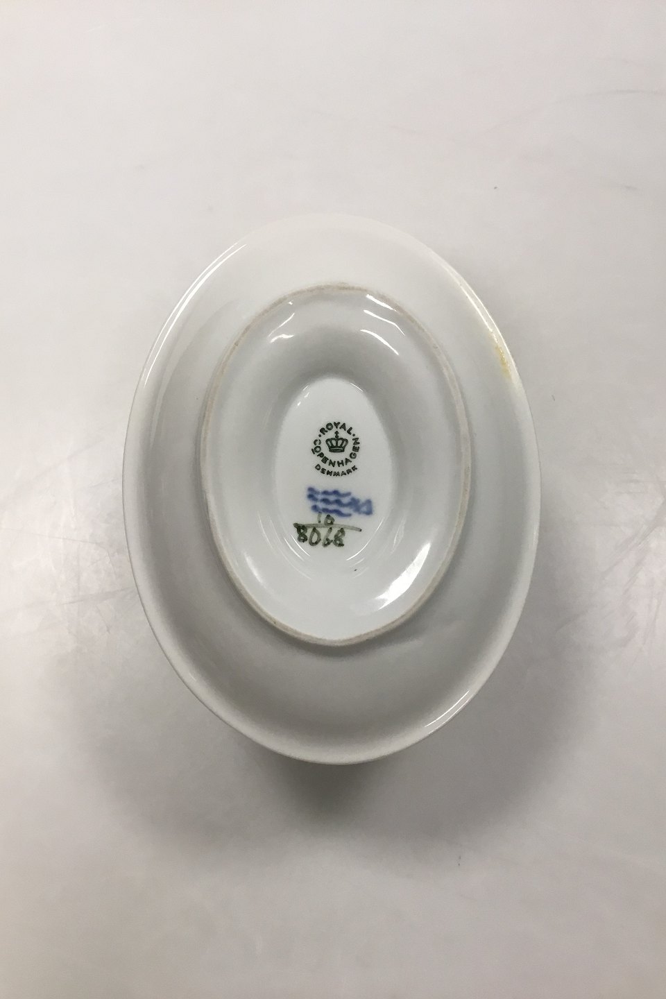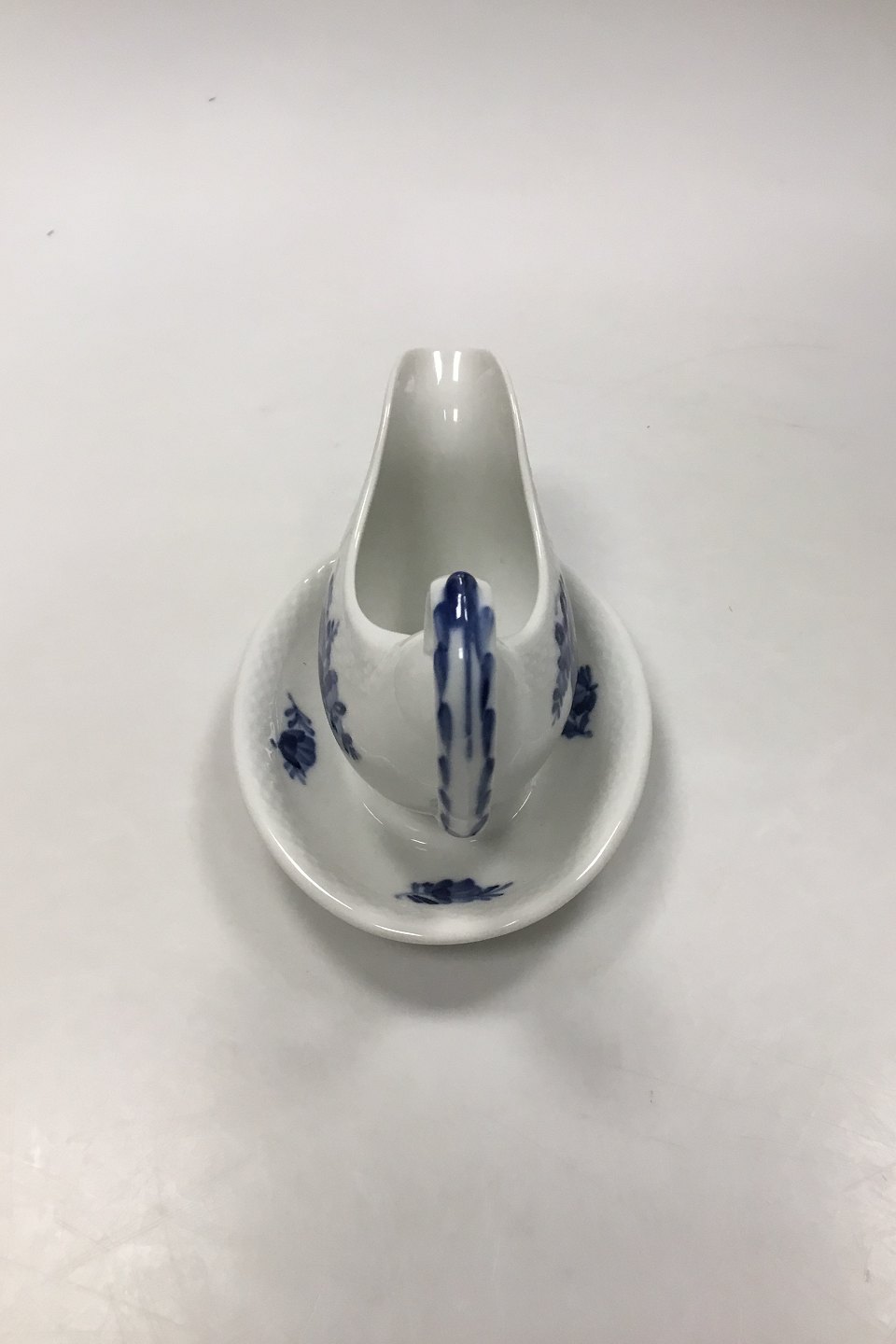 Royal Copenhagen Blå Blomst Flettet Saucekande med Fast Underfad No 8068. Måler 12,5 x 16,5 cm (4 59/64 x 6 1/2 in). Underfad 17 cm (6 11/16 in).