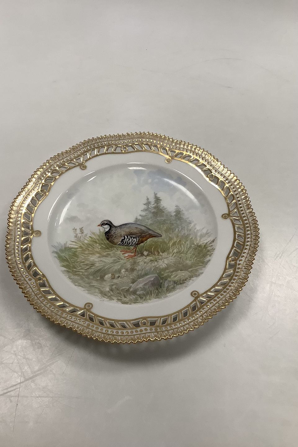 Royal Copenhagen Flora Danica Fugle Frokosttallerken No 20/3554 med gennembrudt kant.