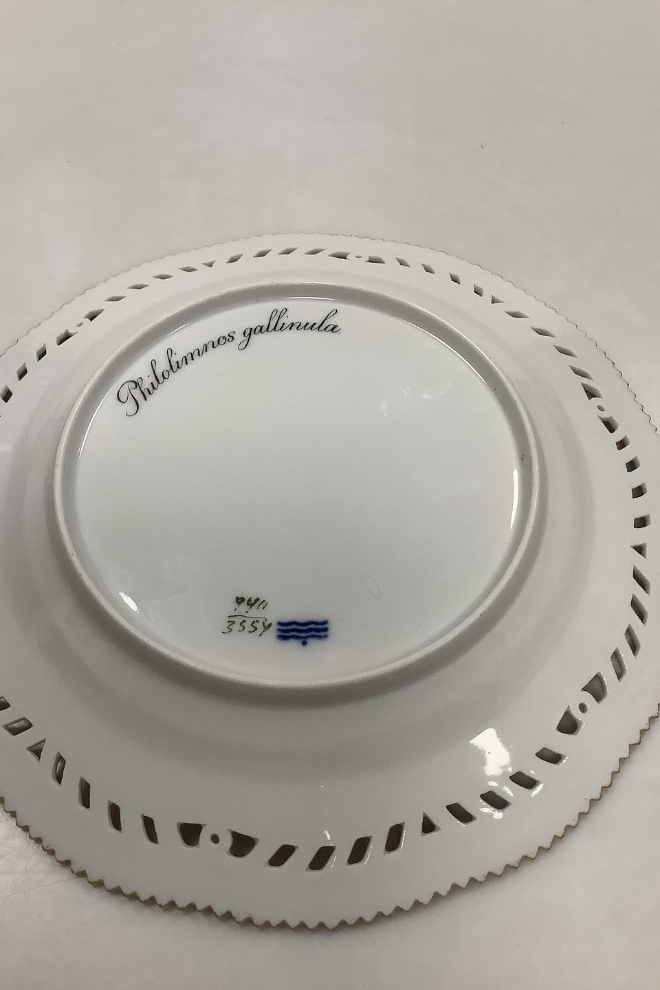 Royal Copenhagen Flora Danica Fugle Frokosttallerken No 20/3554 med gennembrudt kant.