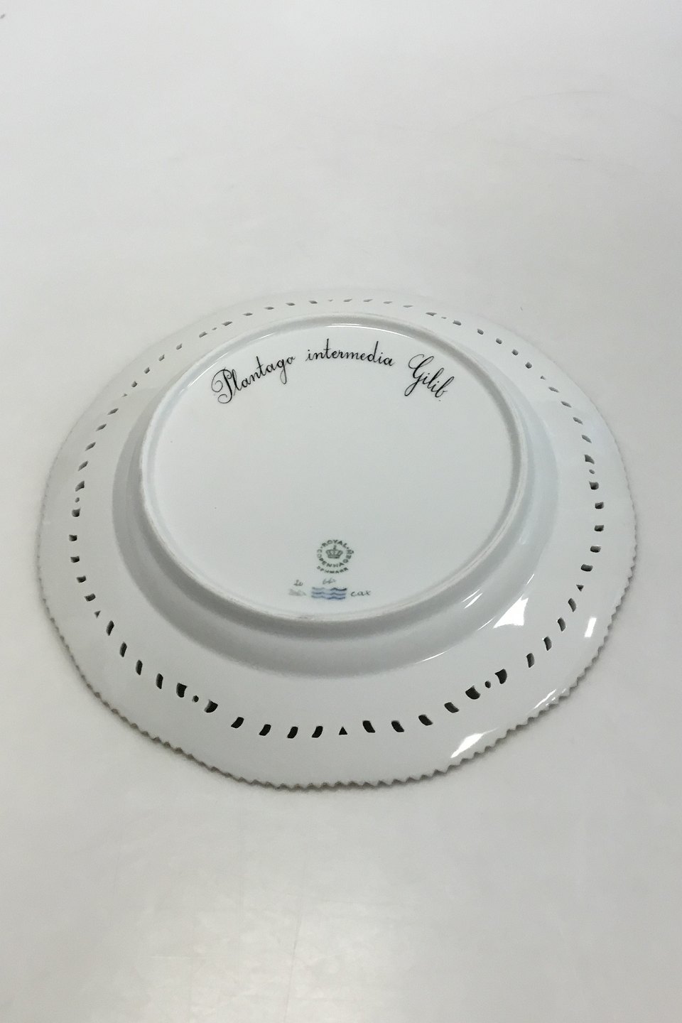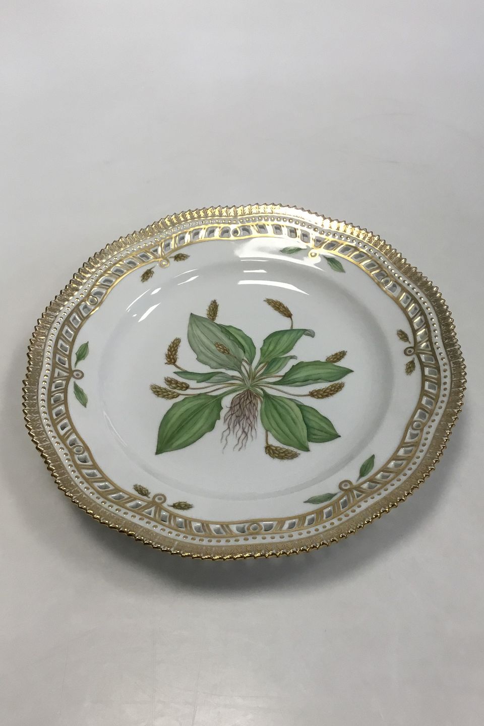 Royal Copenhagen Flora Danica tallerken med gennembrudt kant No 20/3553. Latinsk navn: Plantago intermedia Cjilib. Måler 25,5 cm(10 3/64 in.)