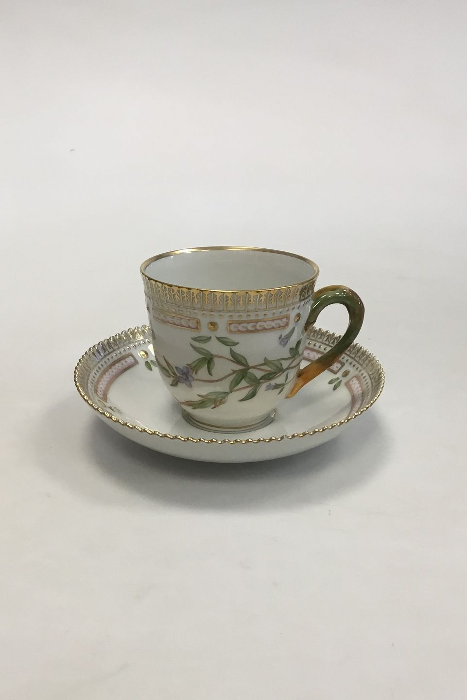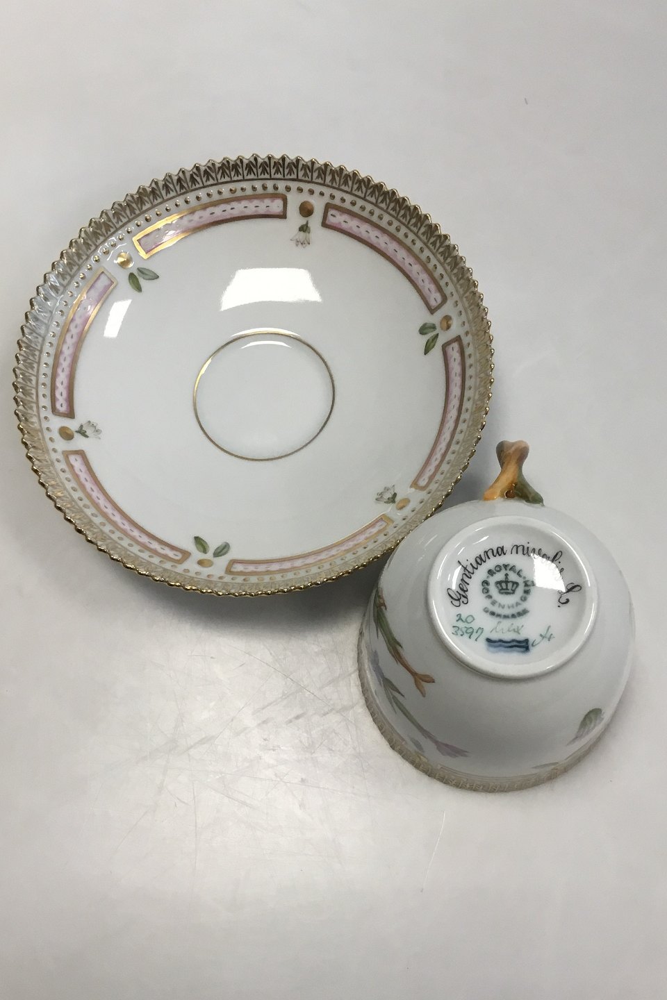 Royal Copenhagen Flora Danica Coffee Cup and Saucer No 20/3597. Latin Name: Gentiana nivalis L Measures Cup: 7 cm / 2 3/4 in. x 7.5 cm / 2 61/64 in. dia. Saucer: 13.8 cm / 5 7/16 in.