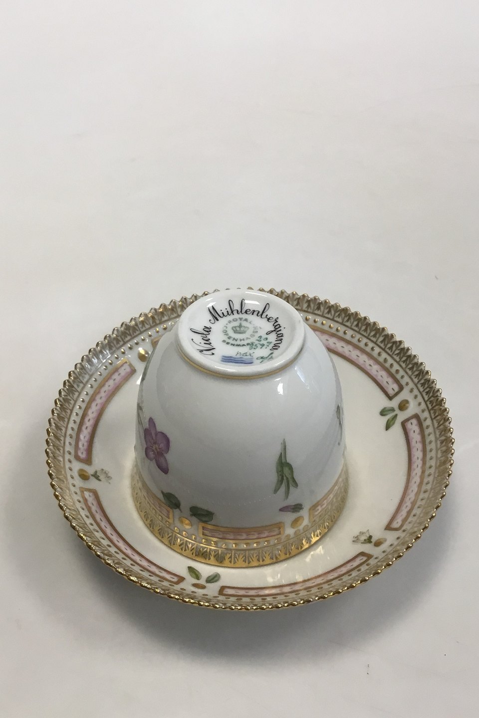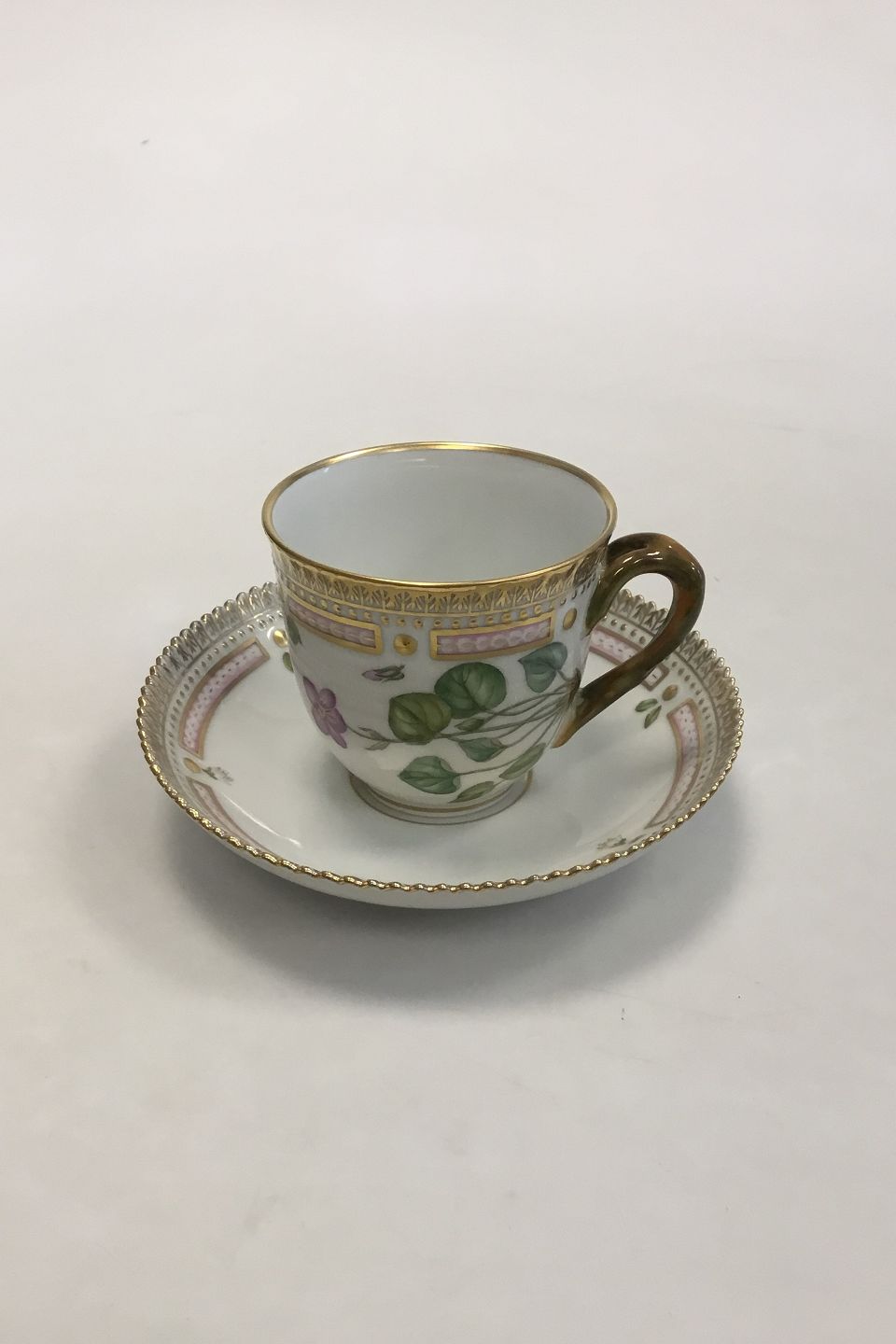 Royal Copenhagen Flora Danica Coffee Cup and Saucer No 20/3597. Latin Name: Viola Muhlenbergiana . Measures Cup: 7 cm / 2 3/4 in. x 7.5 cm / 2 61/64 in. dia. Saucer: 13.8 cm / 5 7/16 in.