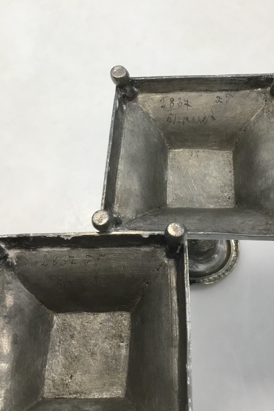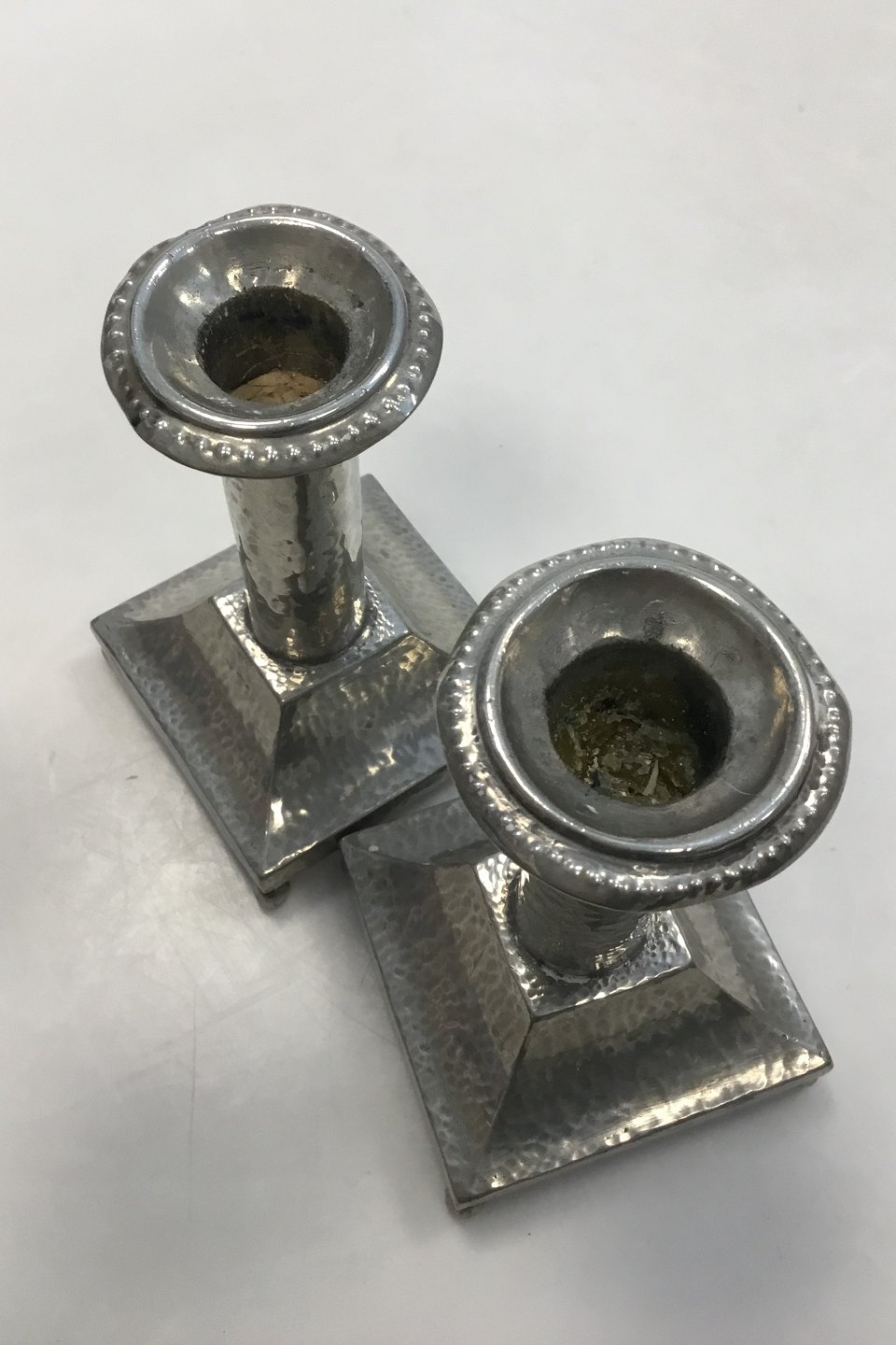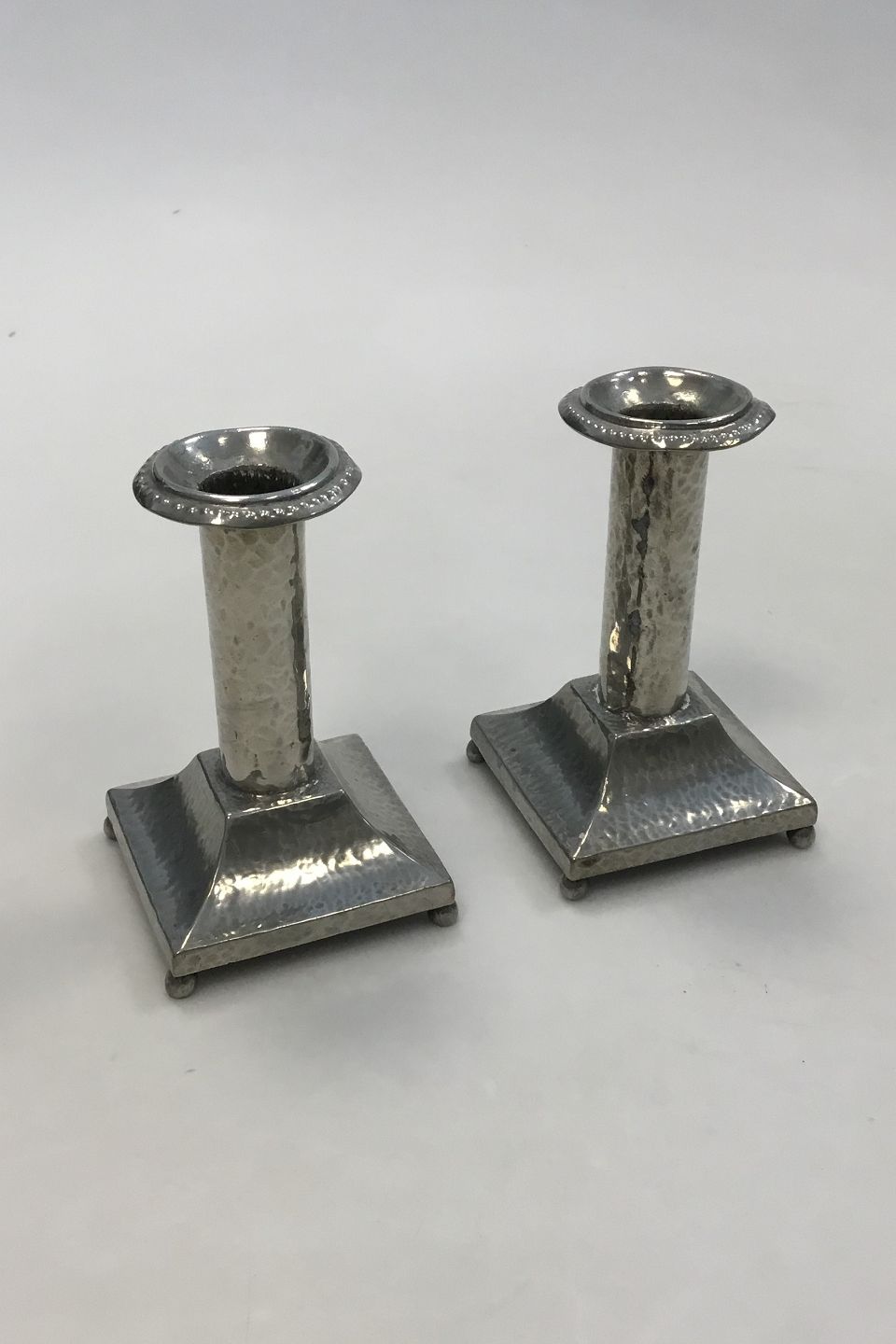 Et par hammerslåede tinlysestager med firkantet base. Med skævheder i lysmanchetten. Måler 11,5 cm(4 17/32 in.)