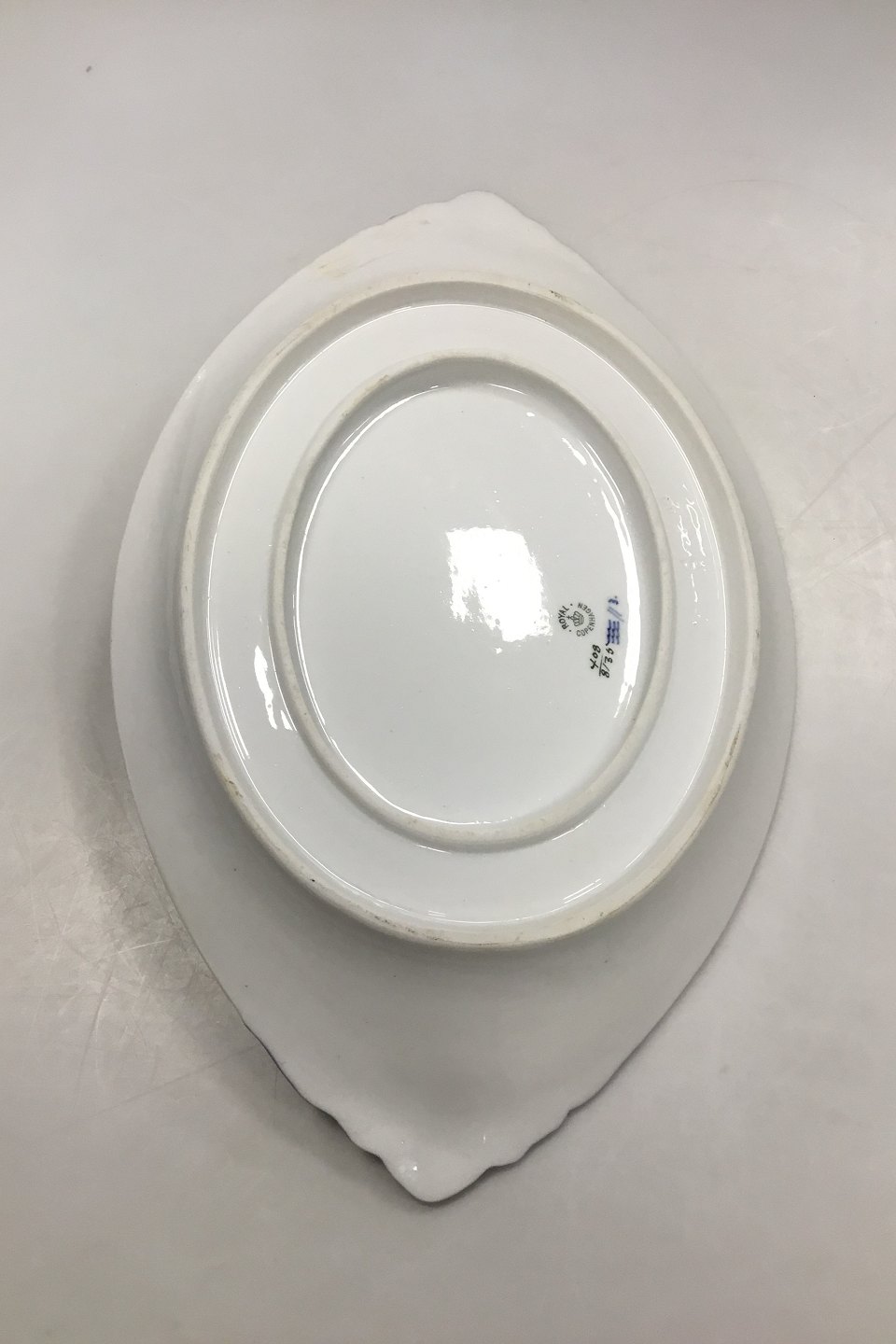 Royal Copenhagen Rosenknop Terrin u/låg No 8034 med underfad No 8035. Terrin måler 34 x 22 x 13 cm (13 25/64 x 8 21/32 x 5 1/8 in). Underfad måler 45 x 28 cm (17 23/32 x 11 1/32 in).