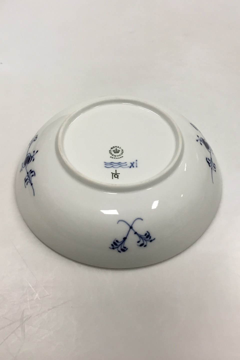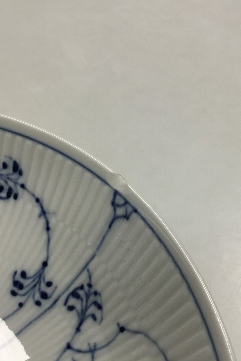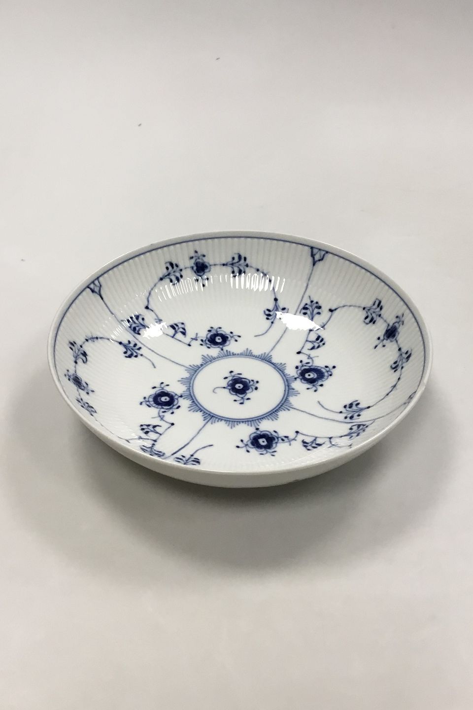 Royal Copenhagen Musselmalet Riflet Lav skål No 19. 1. sortering. Måler 21,5 cm ( 8 15/32 in. ) Har et afslag på kanten