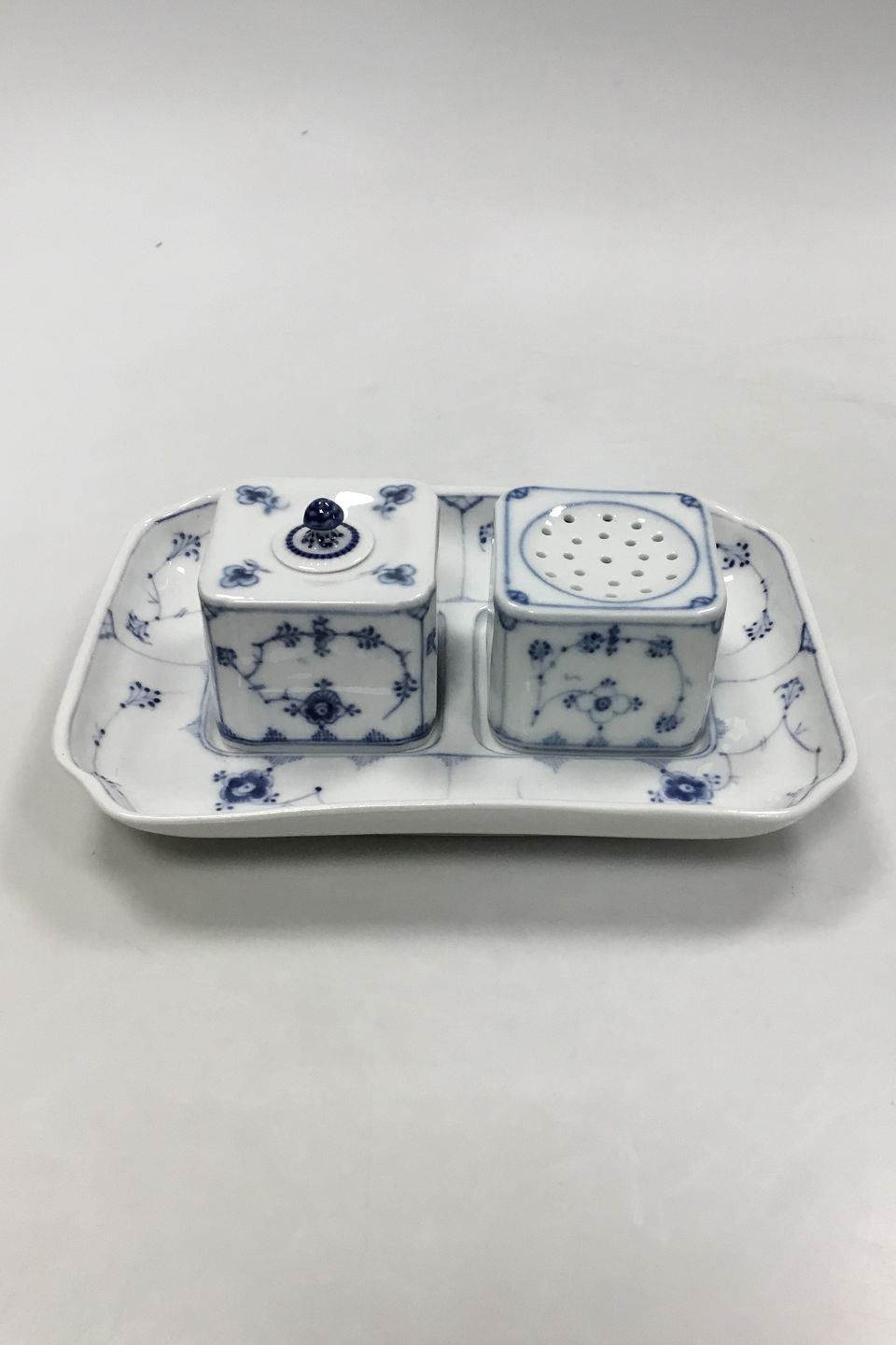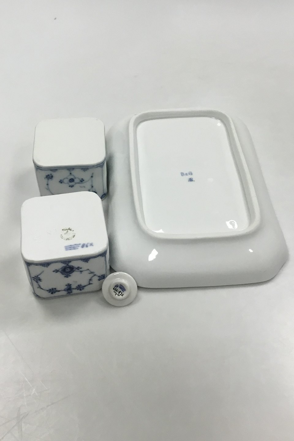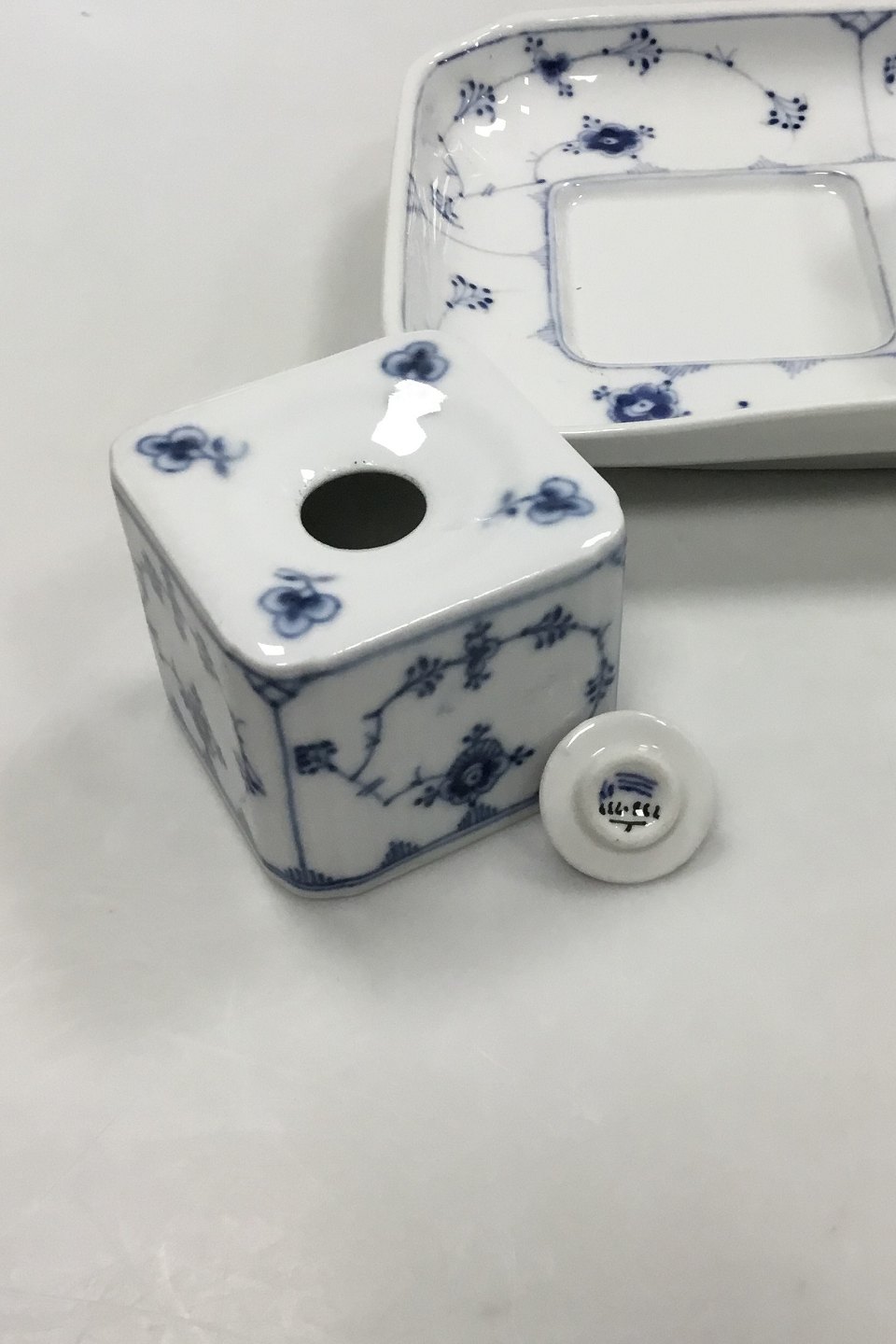 Early Royal Copenhagen Blue Fluted Plain Inkwell with tray and container for Ink and Sand. Combined Bing og Grondahl and Royal Copenhagen. Measures 23 cm / 9 1/16 in. x 16 cm / 6 19/64 in.