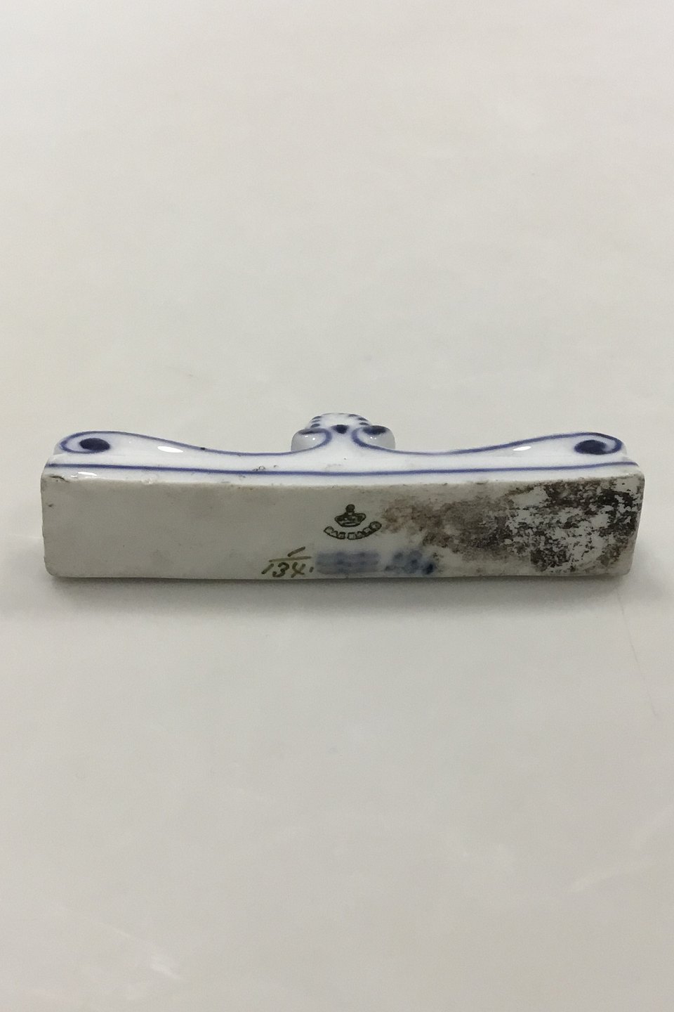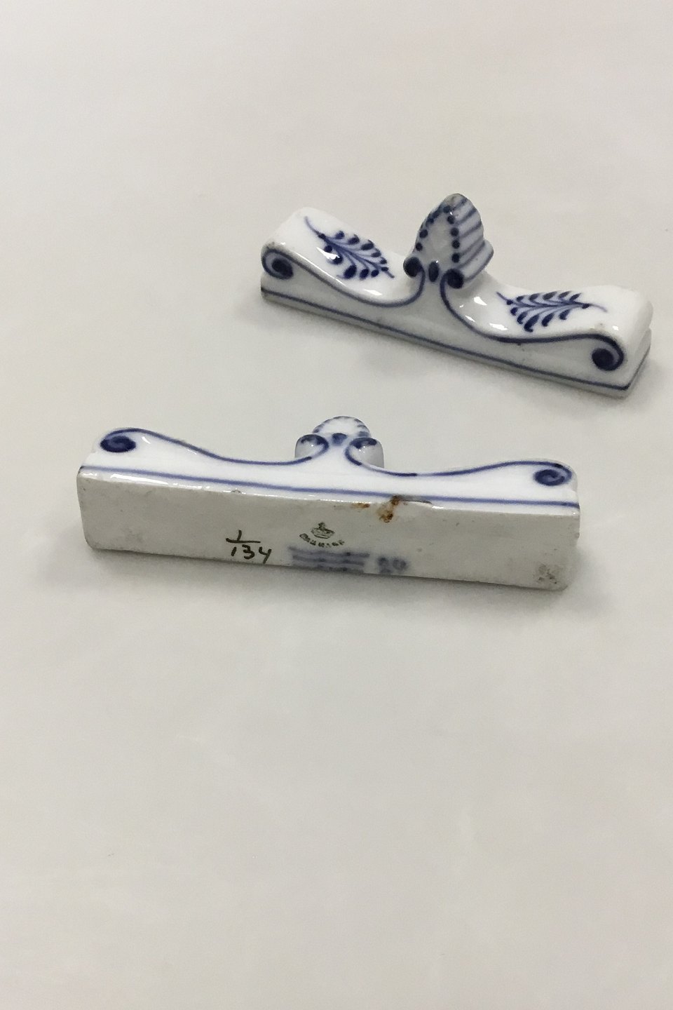 Royal Copenhagen Blue Fluted Plain A pair of Knife Rests No 134. Measures 8 cm x 3 cm / 3 5/32 in. x 1 3/16 in. Both with chips