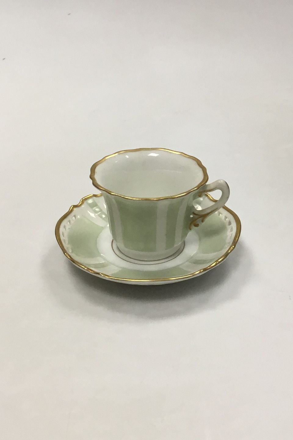 Dahl Jensen Dronningstel med grøn dekoration Mokkakop. Måler Kop: 5 cm x 7 cm dia. Underkop: 11,5 cm ( 2 in. x 2 3/4 in. dia. Saucer: 4 17/32 in.
