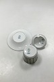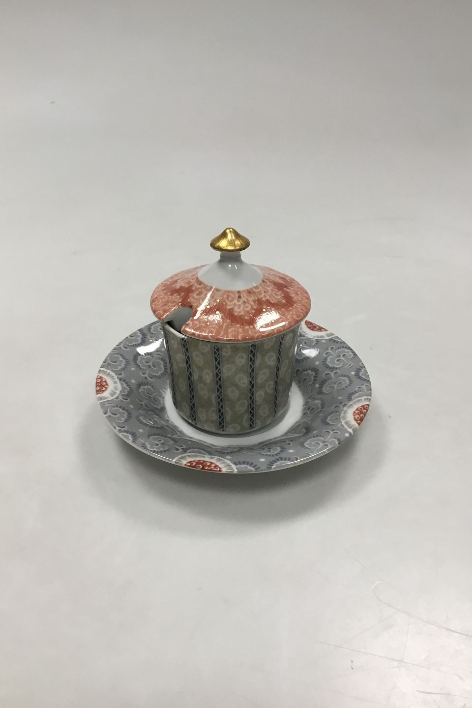 Royal Copenhagen Fairytale Sennepskrukke No 200 med låg No 199, og underskål No 198 i Grå/Terracotta. Krukke med låg måler 6,8 x 9 cm (2 43/64 x 3 35/64 in). Underskål måler 12,5 cm (4 59/64 in).