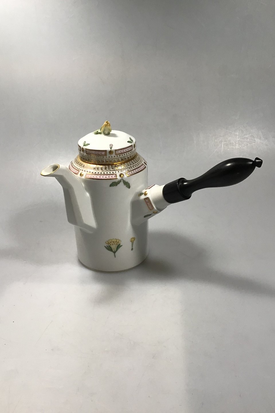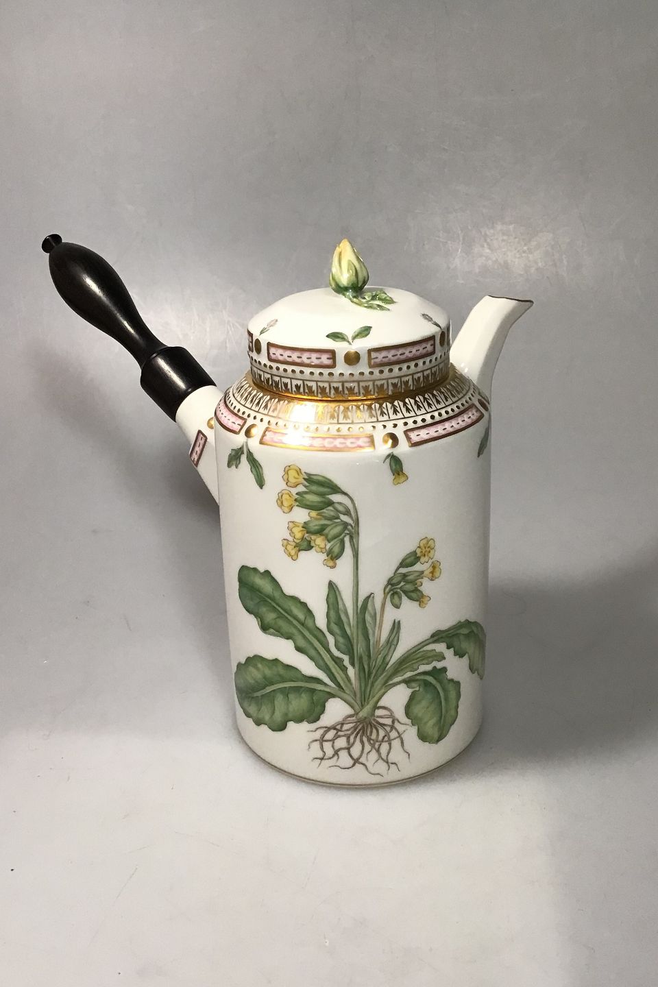 Royal Copenhagen Flora Danica Kaffekande No 3620 (128) Træhåndtag Latinsk Navn: Primula veris elatior Oed 1 sort Holder 6 kopper Måler H 17.5 cm (6.88 in)