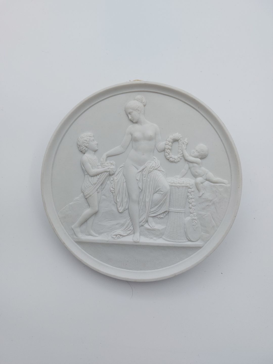 Bertel Thorvaldsen: Bing og Grøndahl bisquit platte "Barndom og Forår". Efter relief modelleret i Rom 1836. Måler 14,5 cm (5.70 inch). Fremstillet i slutningen af 19. århundrede