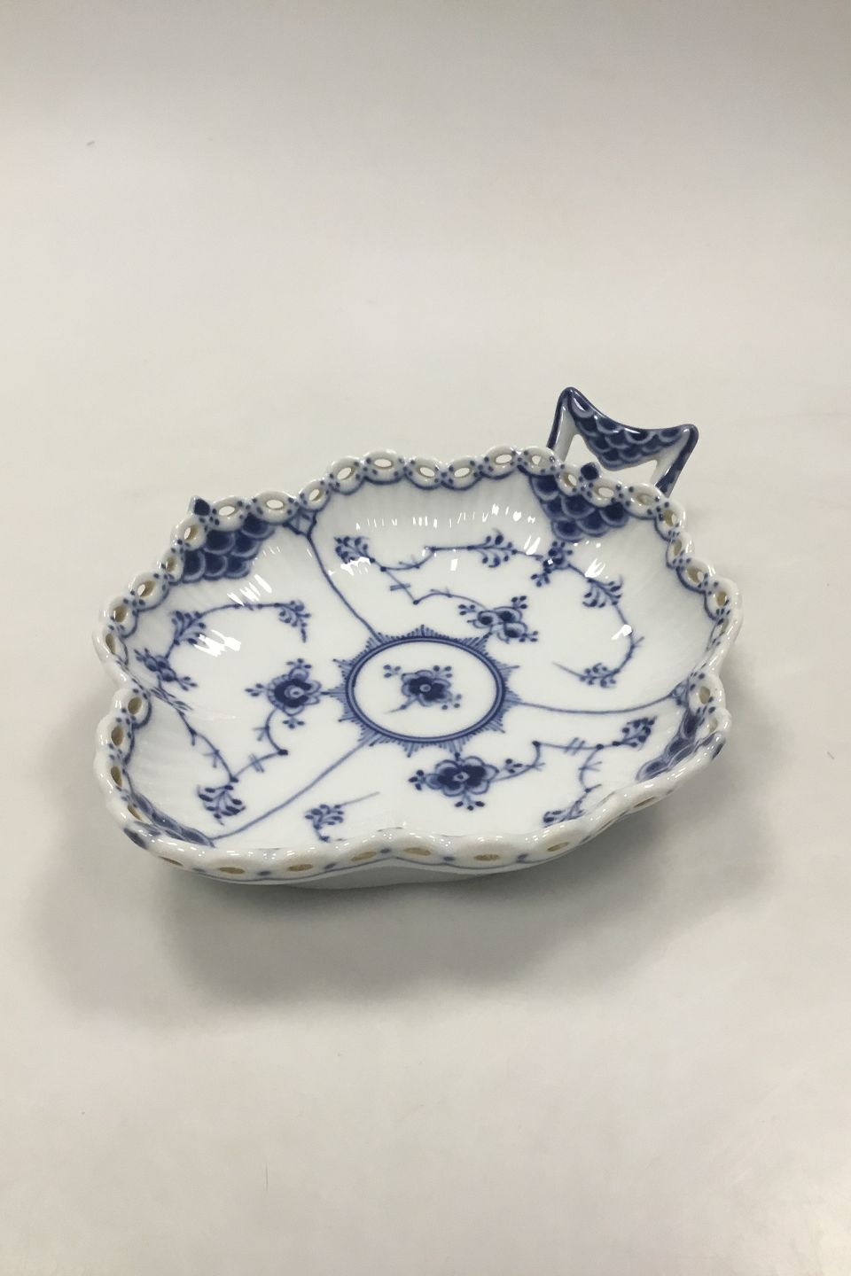 Royal Copenhagen Musselmalet Helblonde Bladformet fad No 1076. 1. sortering. Måler 18,5 cm ( 7 9/32 in. ). Er mærket 1016, meget 1 tallet er et dårligt 7 tal. Da det skal være 1076.
