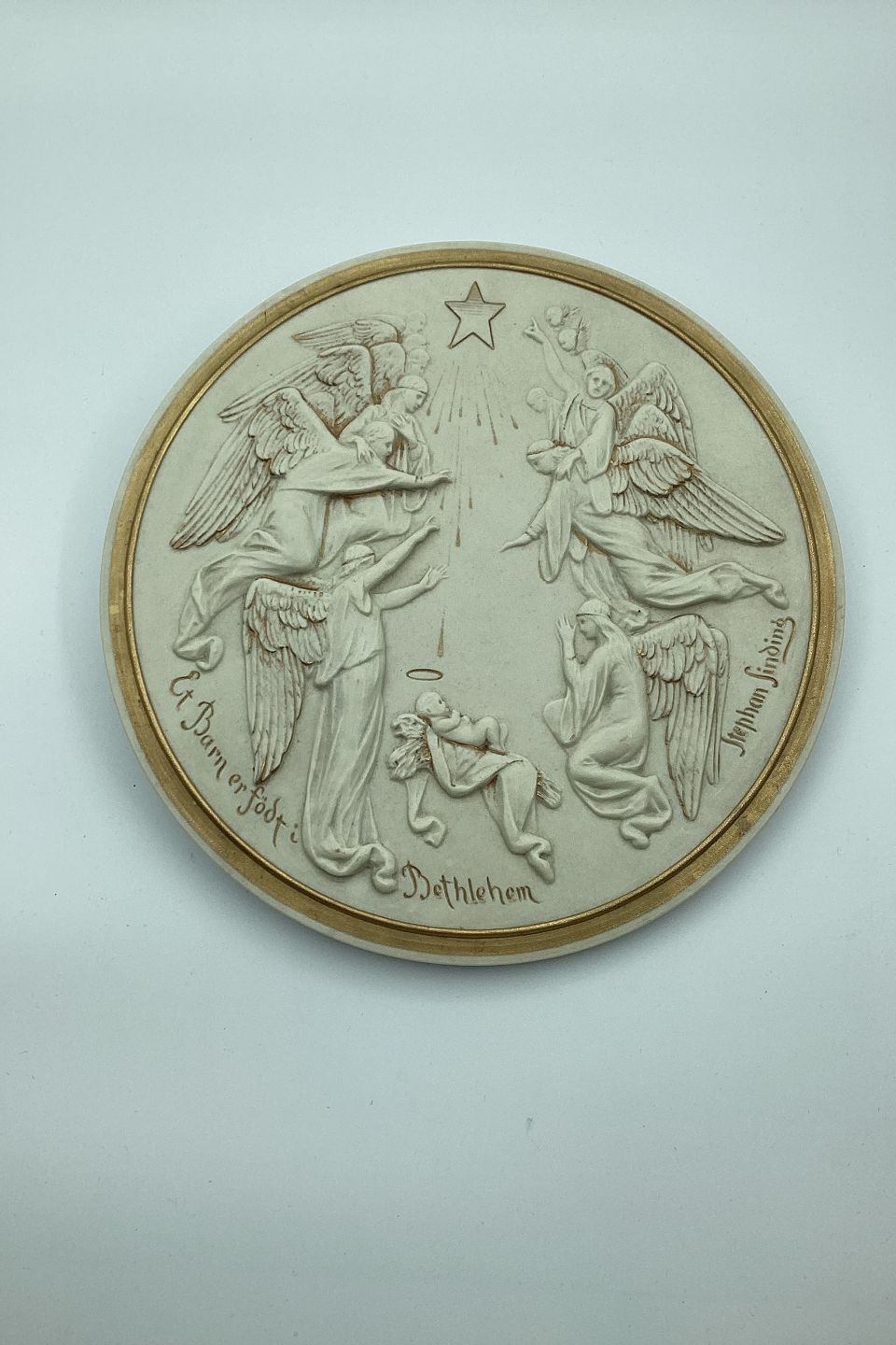 Stephen Sinding: Bing og Grøndahl bisquit platter "Et Barn er født i Bethlehem". I god stand. Fremstillet i slutningen af 19. århundrede. Delvis guldstafferinger på dekorationen samt i teksten. Måler 24 cm i diameter (9.44 inch)