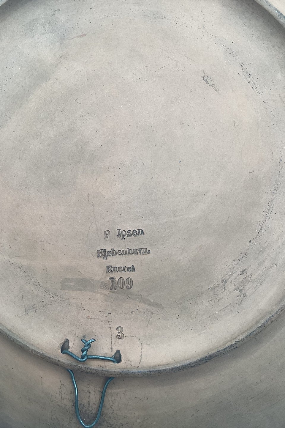 Terracotta platte fra Peter Ipsen, Kjøbenhavn, fremstillet omkring 1900. Bemalet art nouveau dekoration med hvid lilje samt et par insekter. I god stand. Måler 20,5cm (8.07 inch)