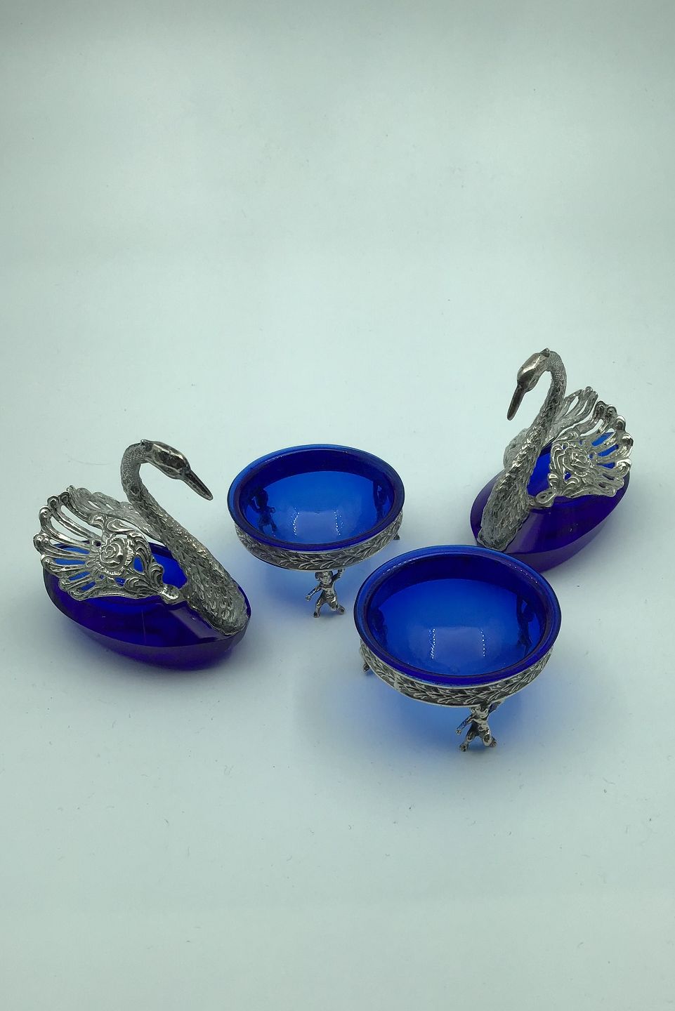 Tyske? Sølv Saltkar i blåt glas (4) To åbne saltkar og to udformet som Svaner med bevægelige vinger Samlet vægt 216.7 gr 7.64 oz