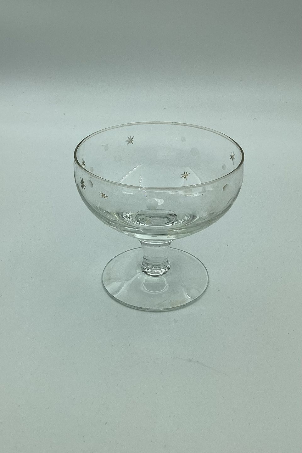 Champagneskål i glas fra Holmegaard Glasværk ca. 1930. Dekoreret med slibninger af måner og stjerner. Mål: H. 9 cm (3.54 inch) Ø. 9,5 cm (3.74 inch)
