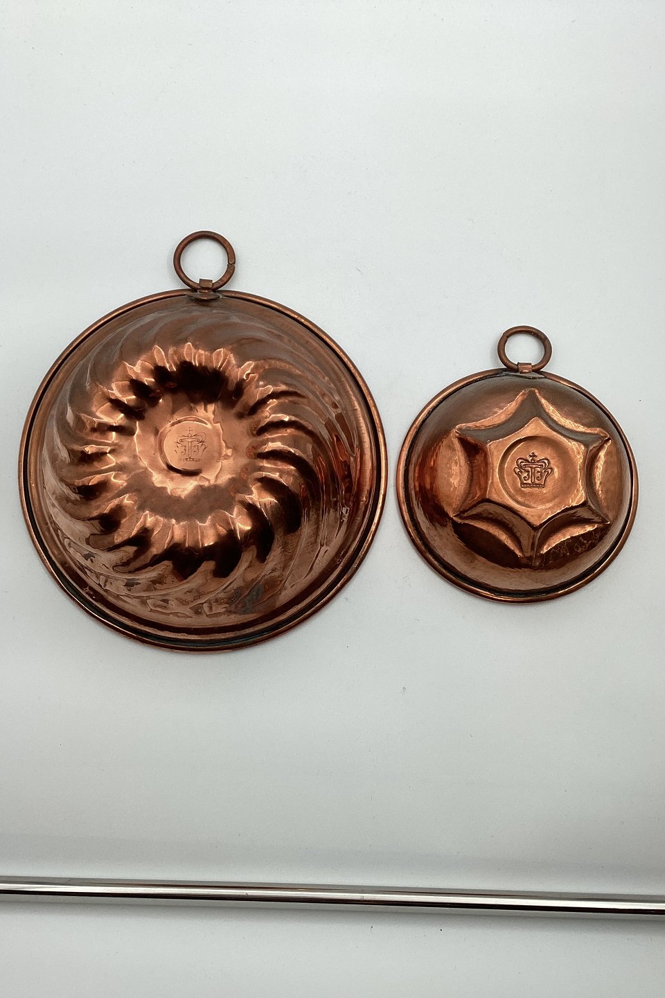 To kobber budding forme. Begge i god stand. Stemplet med krone ! Åbningsdiameter på hhv. 13 cm (5.11 inch) og 20 cm (7.87 inch).