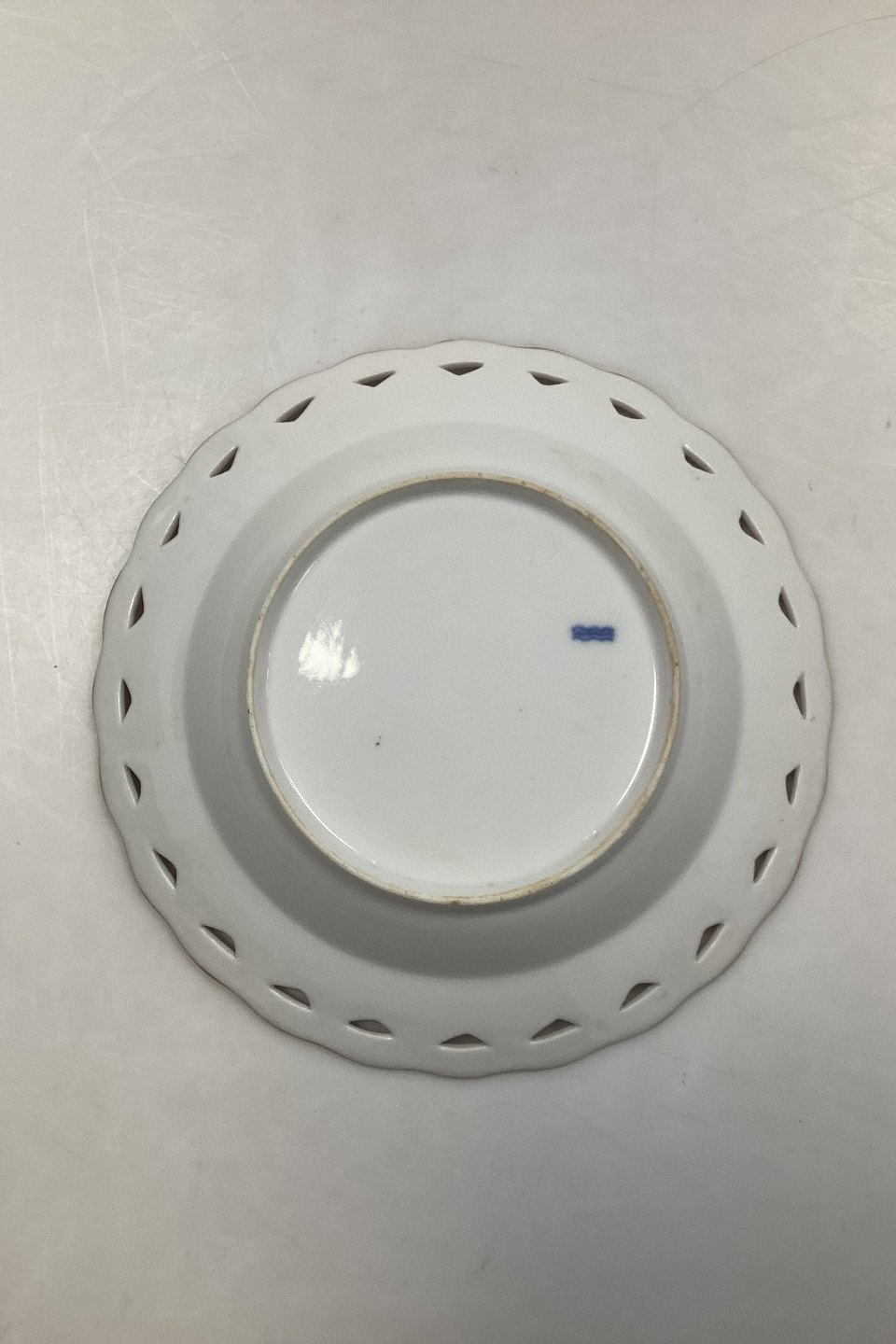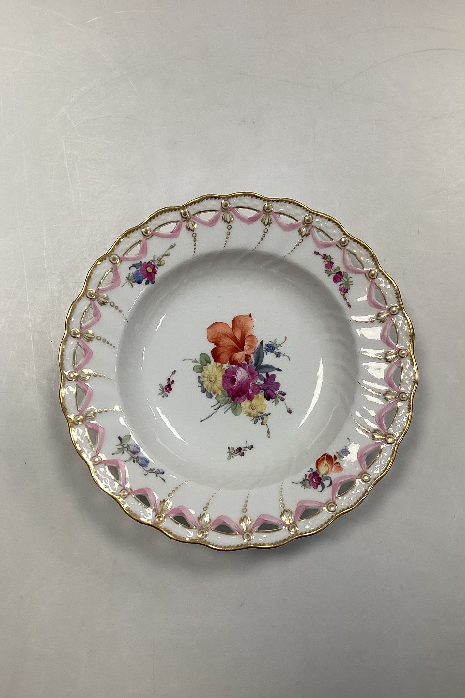 Saxon Flower Deep Plate with Pierced Lace Border from 1860-1890. 22.5 cm dia (8 55/64"). In nice condition, with No to minimal wear on the gold.