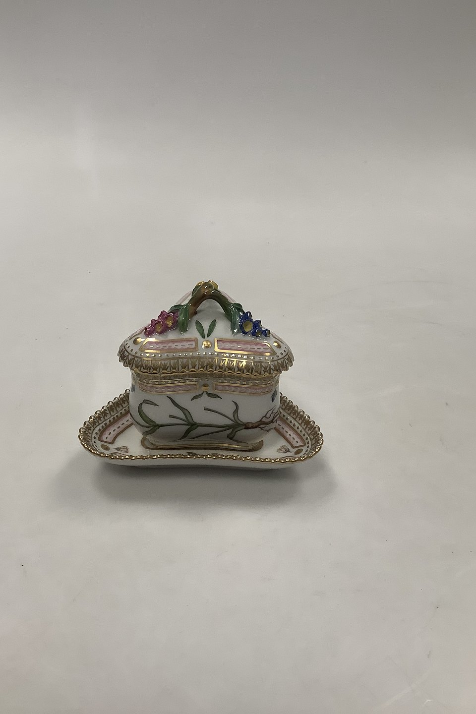 Royal Copenhagen Flora Danica 20/3575 + 20/3576 Trekantet Cremekop Latinsk Navn: "Geniana Sp. oed". Måler H 9 cm Diam 10 cm