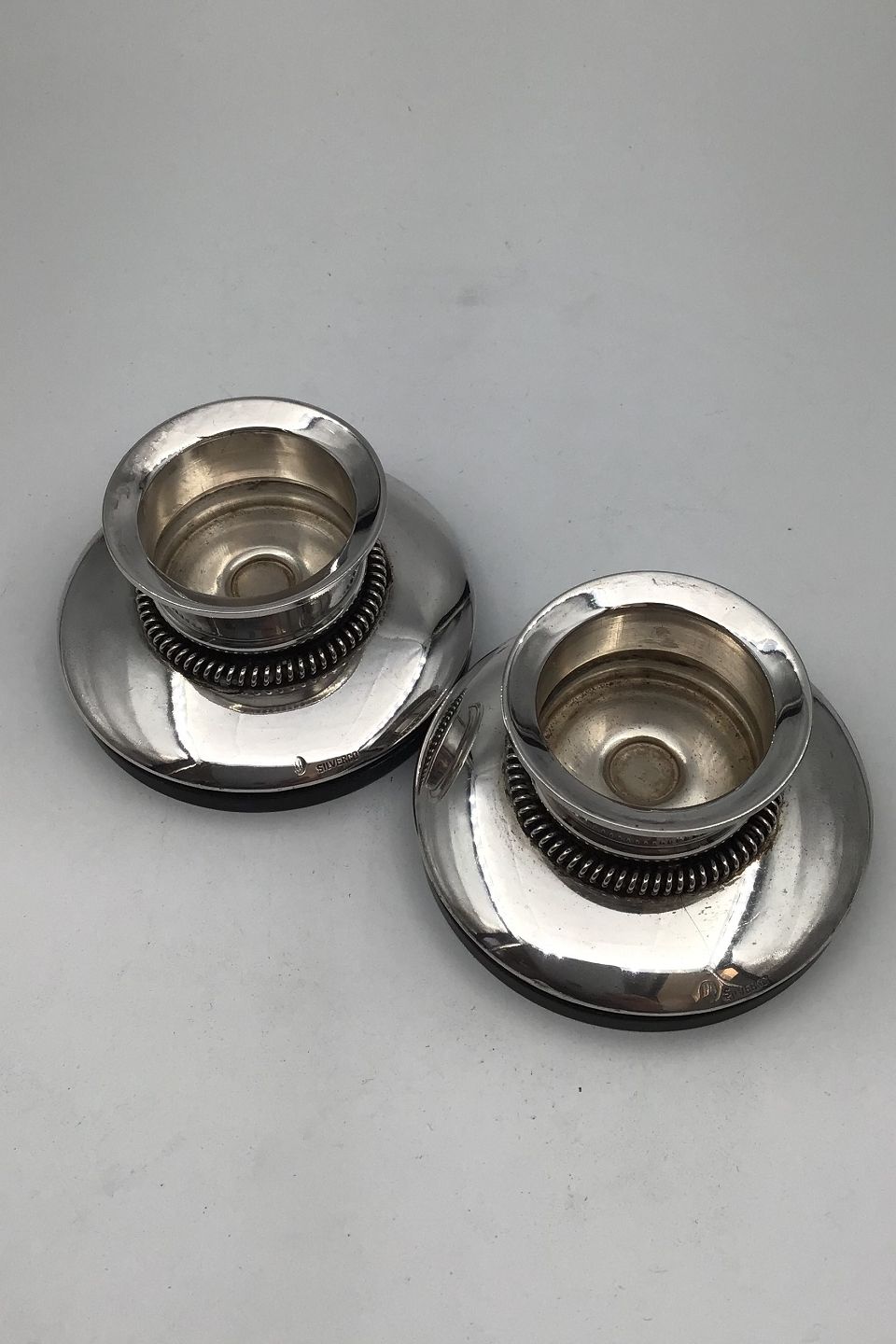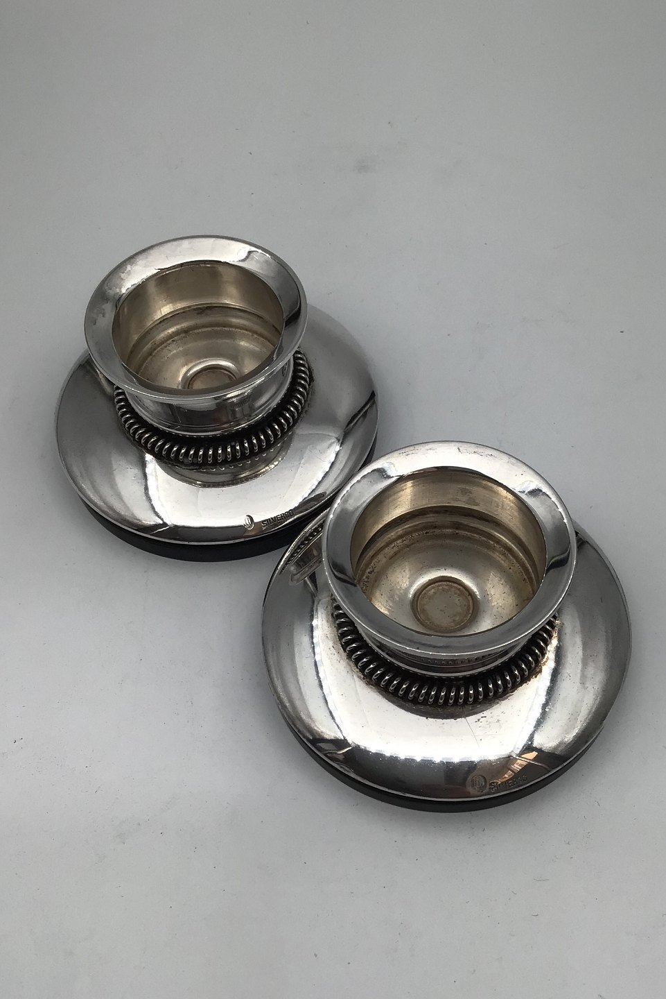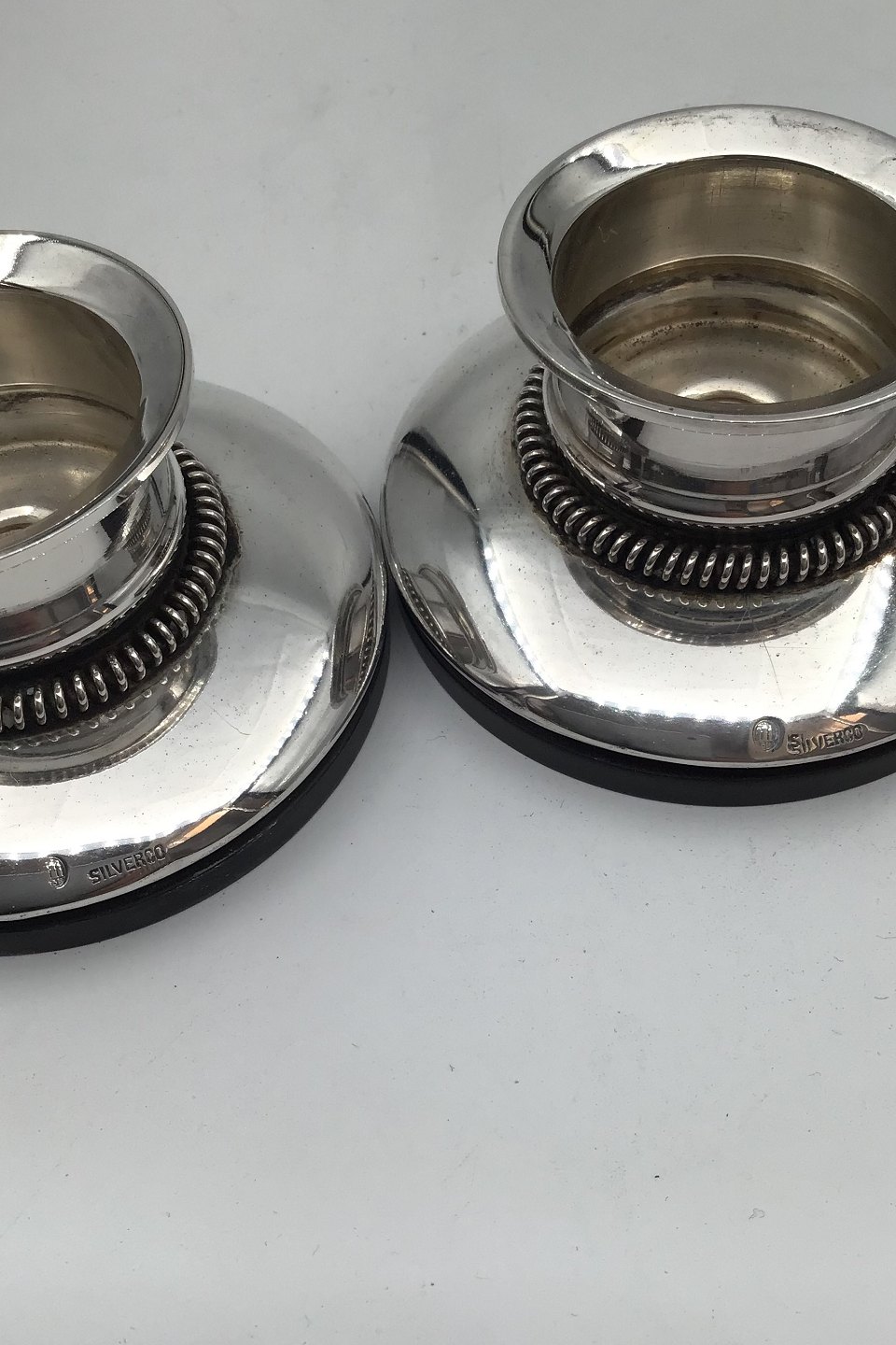 Silverco Silver Candlessticks (Block candles) Measures Diam 8 cm H 4.5 cm Combined Weight incl bakelite base 219.1 gr (7.73 oz)