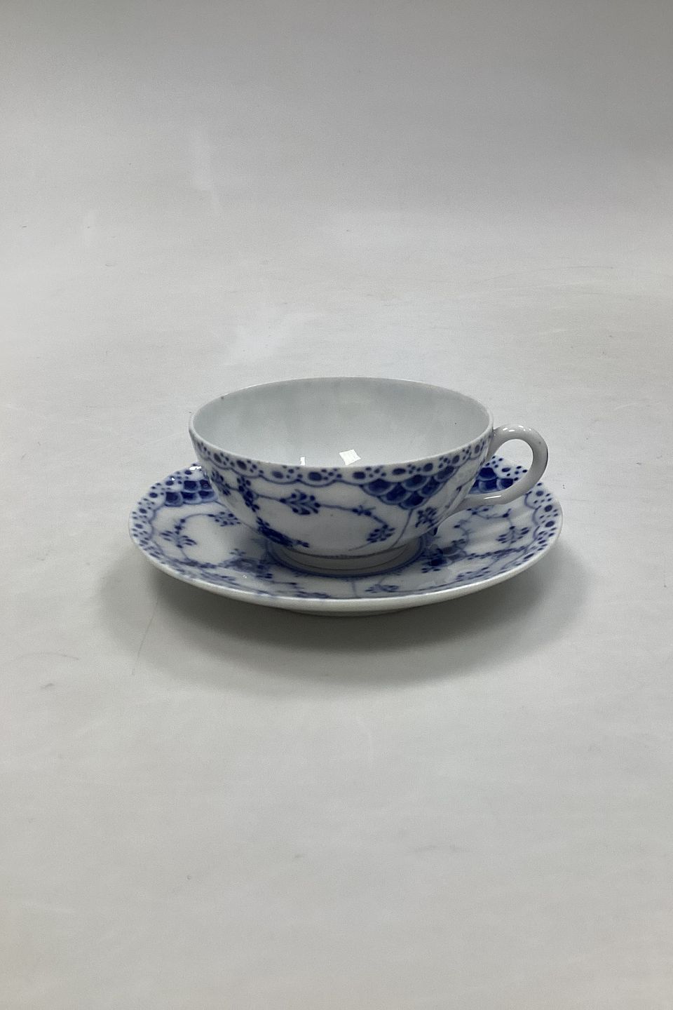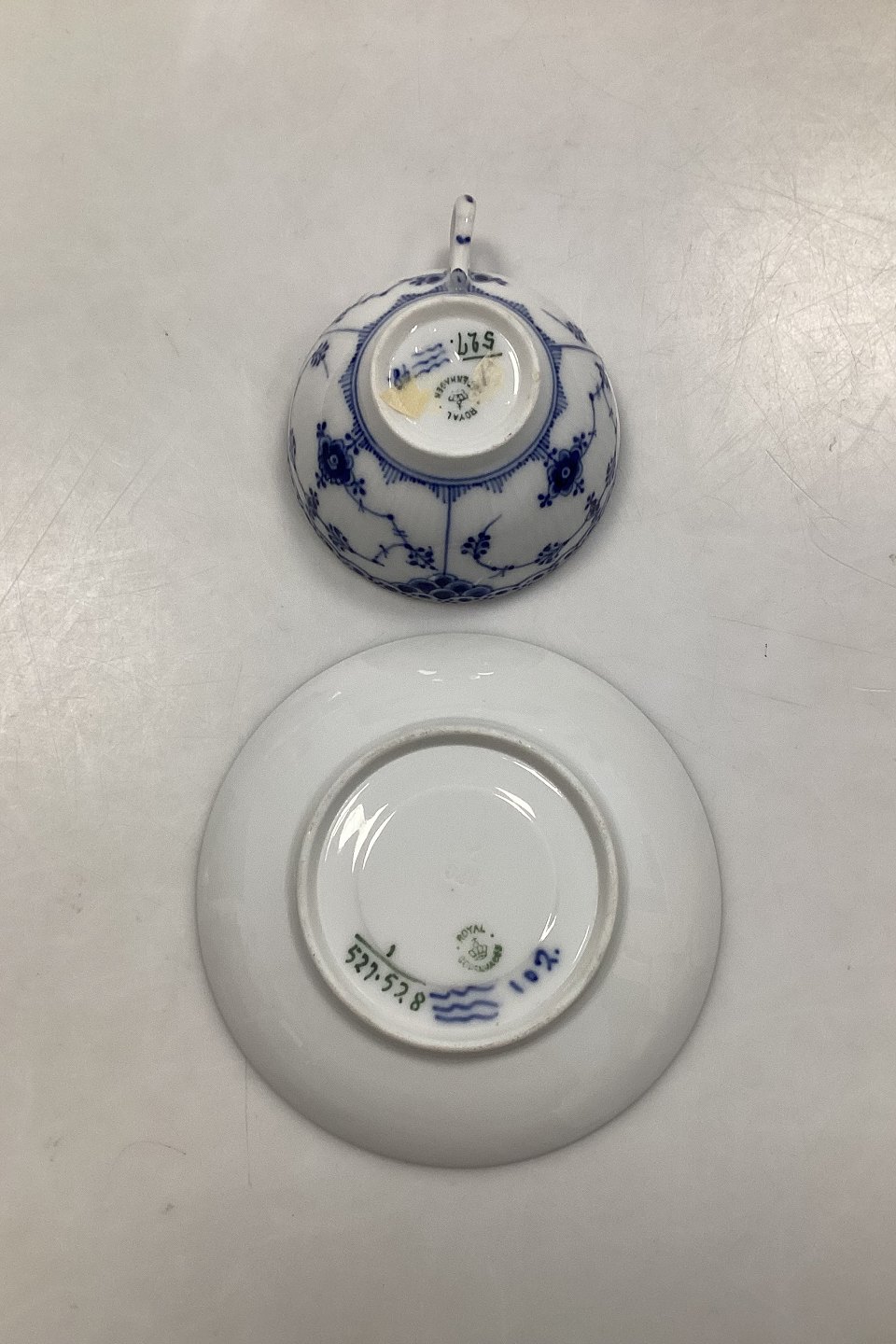 Royal Copenhagen Blue Flute Half Lace Coffee Cup and Saucer No. 756. Measures Cup: 3.5 cm / 1 3/8 in. x 7.5 cm / 2 61/64 in. dia. Saucer: 11.2 cm / 4 13/32 in.