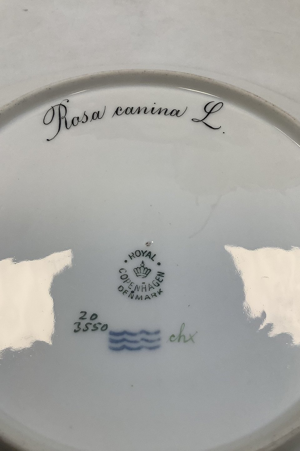 Royal Copenhagen Flora Danica Lunch Plate No 20/3550. Measures 22 cm / 8 21/32 in. 1st Quality. Latin name: "Rosa canina L"