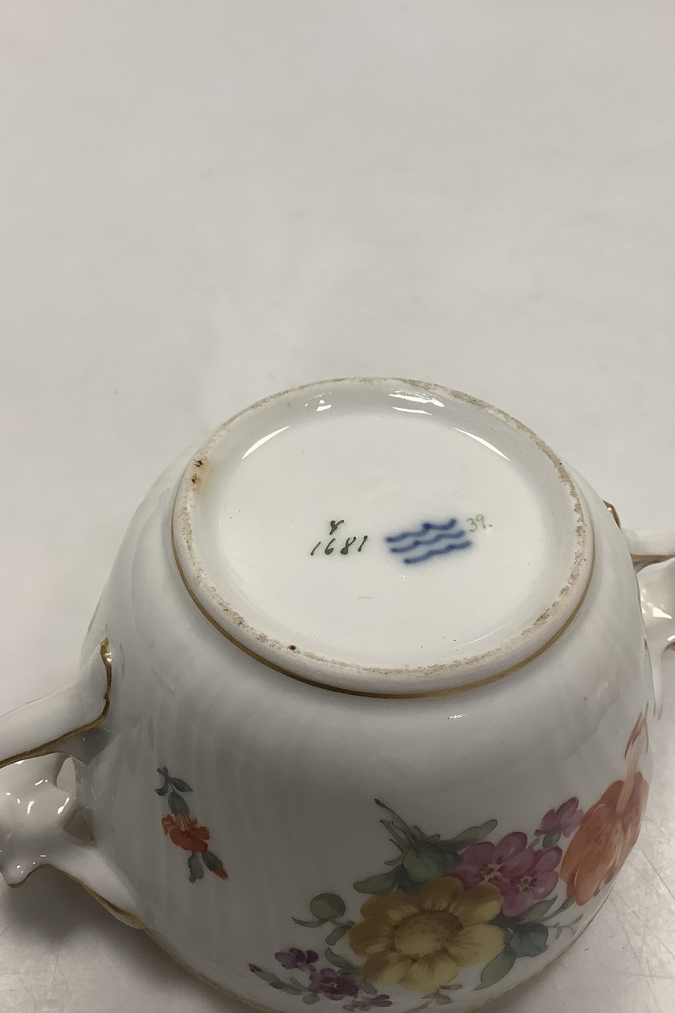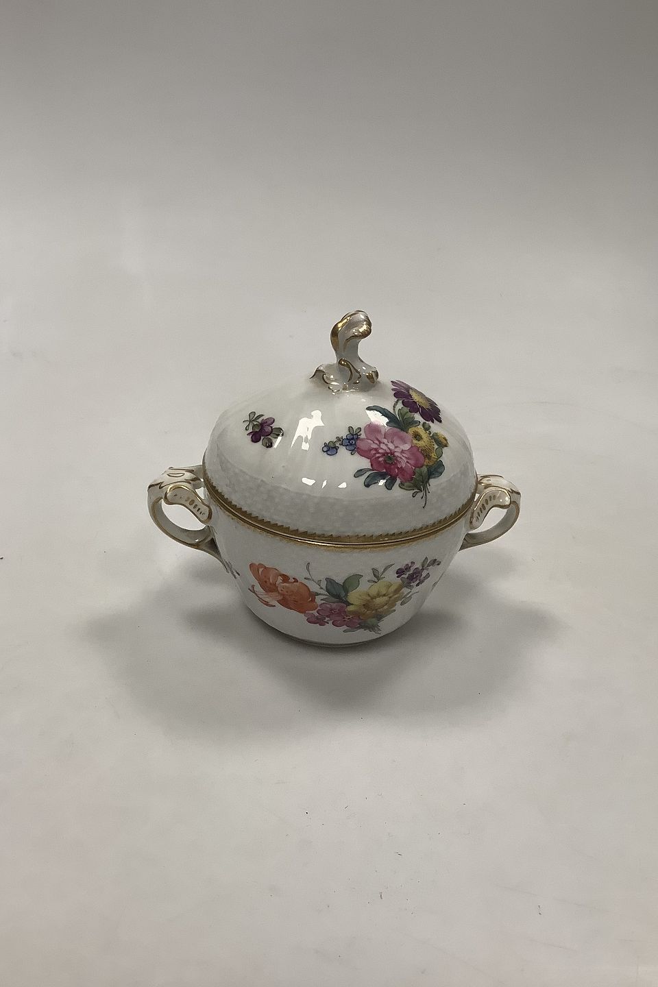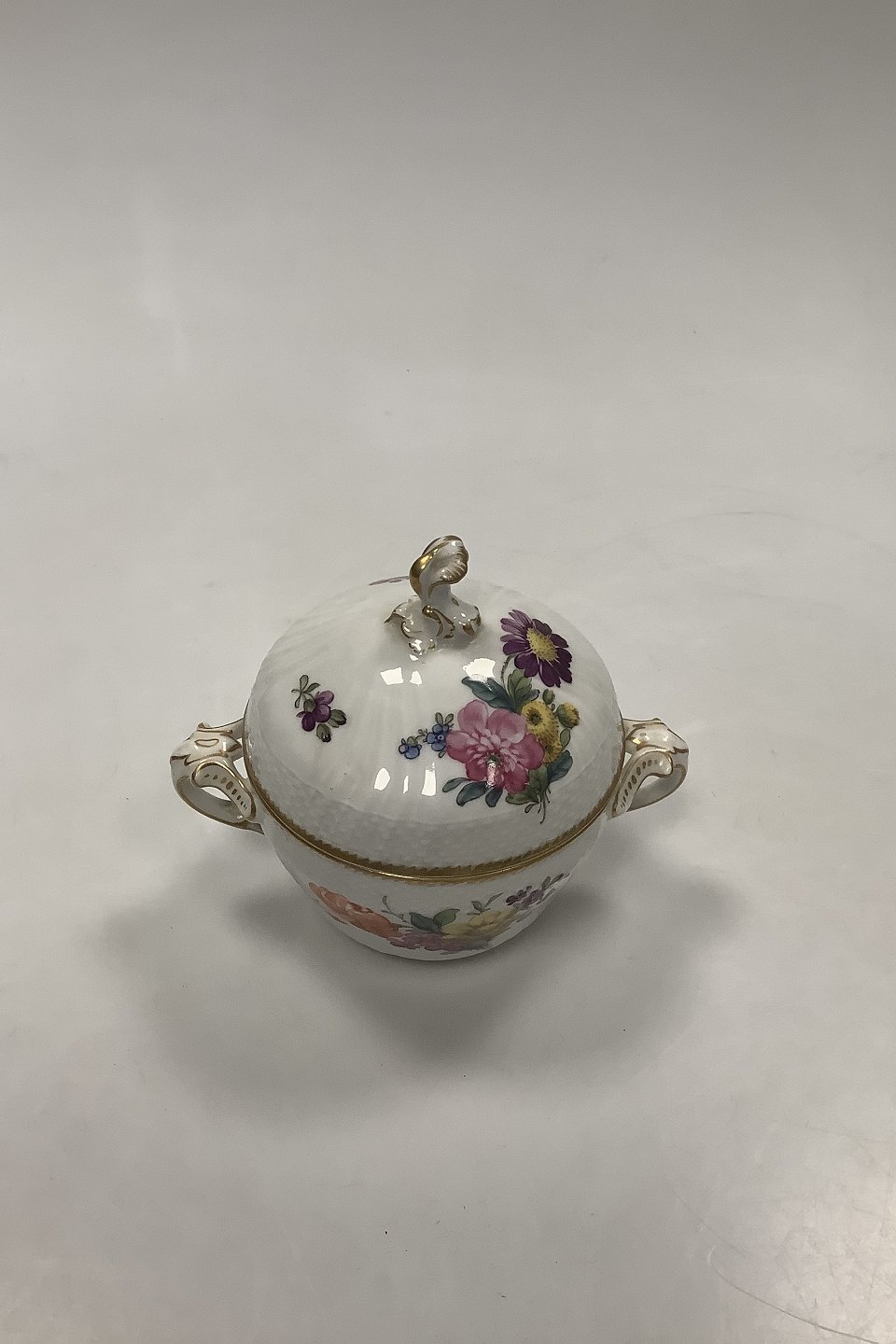 Royal Copenhagen Fuld Saksisk Blomst Sukkerskål med Låg No 1681. Måler uden låg 7.5 x 10.5 cm (2 61/64" x 4 9/64")