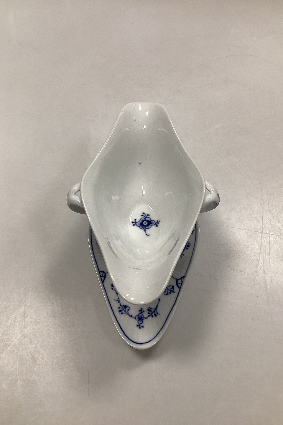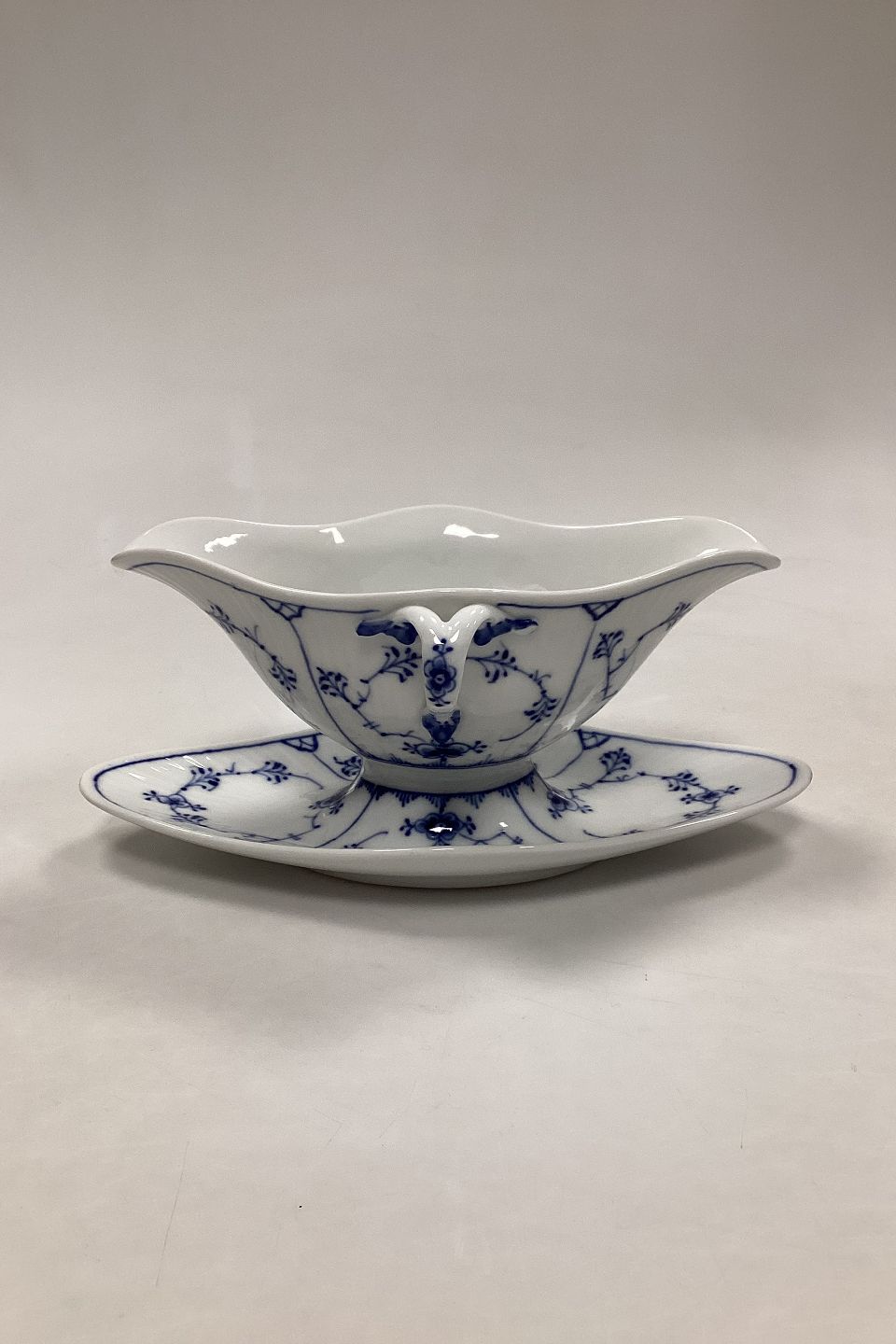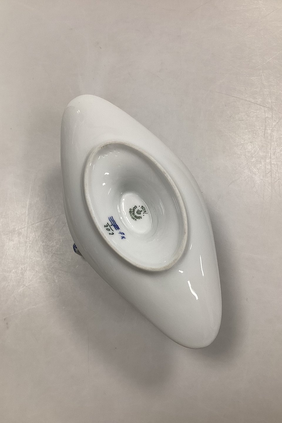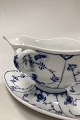 Royal Copenhagen Musselmalet Riflet Sauceskål No. 202. Måler 24,5 cm x 10 cm / 9 41/64 in. x 3 15/16 in. Lille sort prik i skålen, afslag øverst på hankens vedhæftning, og bunden står noget vakkelvornt.