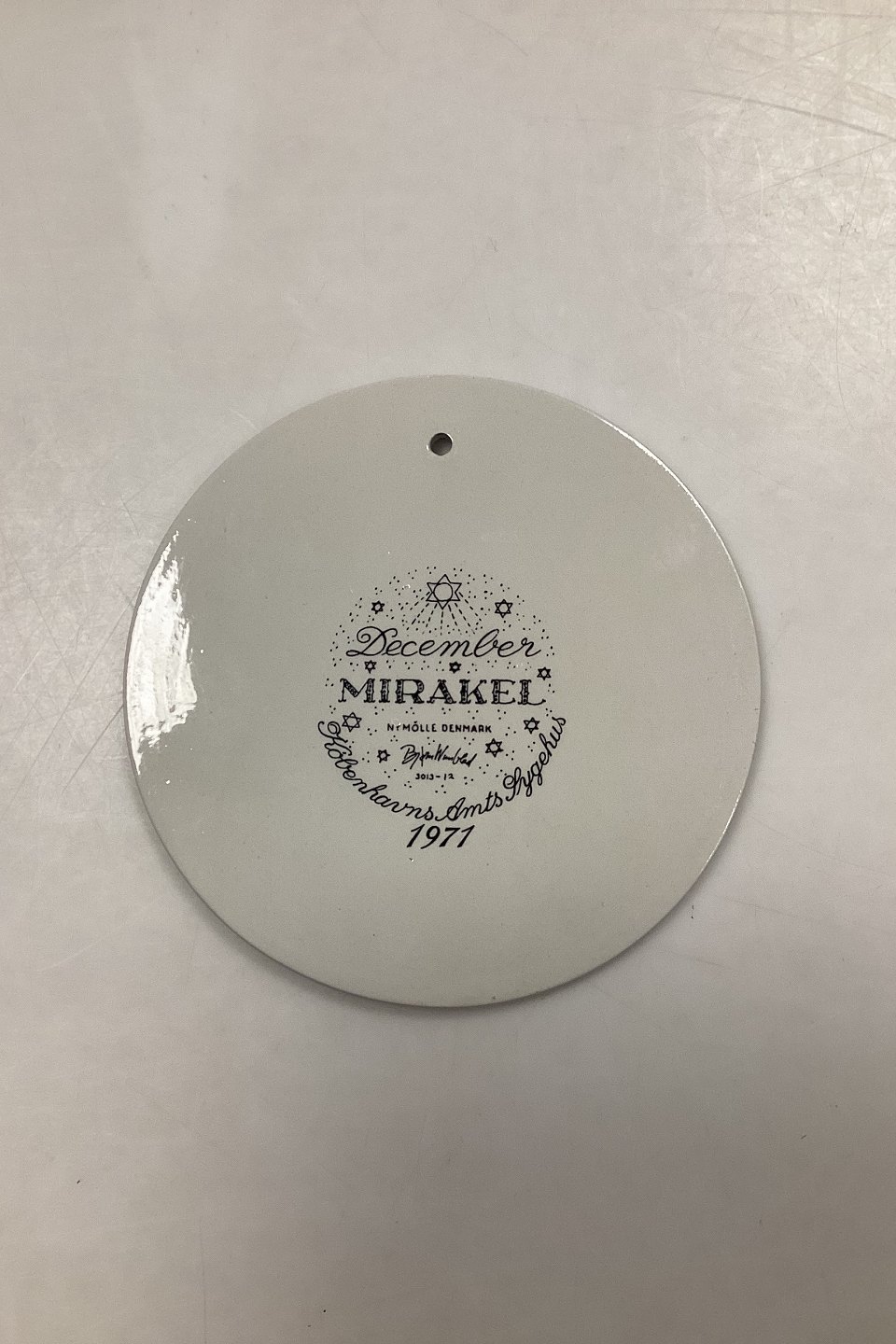 Månedsplatte i fajance for december MIRAKEL. Lavet specielt til Københavns Amts Sygehus 1971. Designet af Bjørn Wiinblad for Nymølle. I perfekt stand. Fabriksmærket på bagsiden. Mål: 15 cm (5.90 inch.)