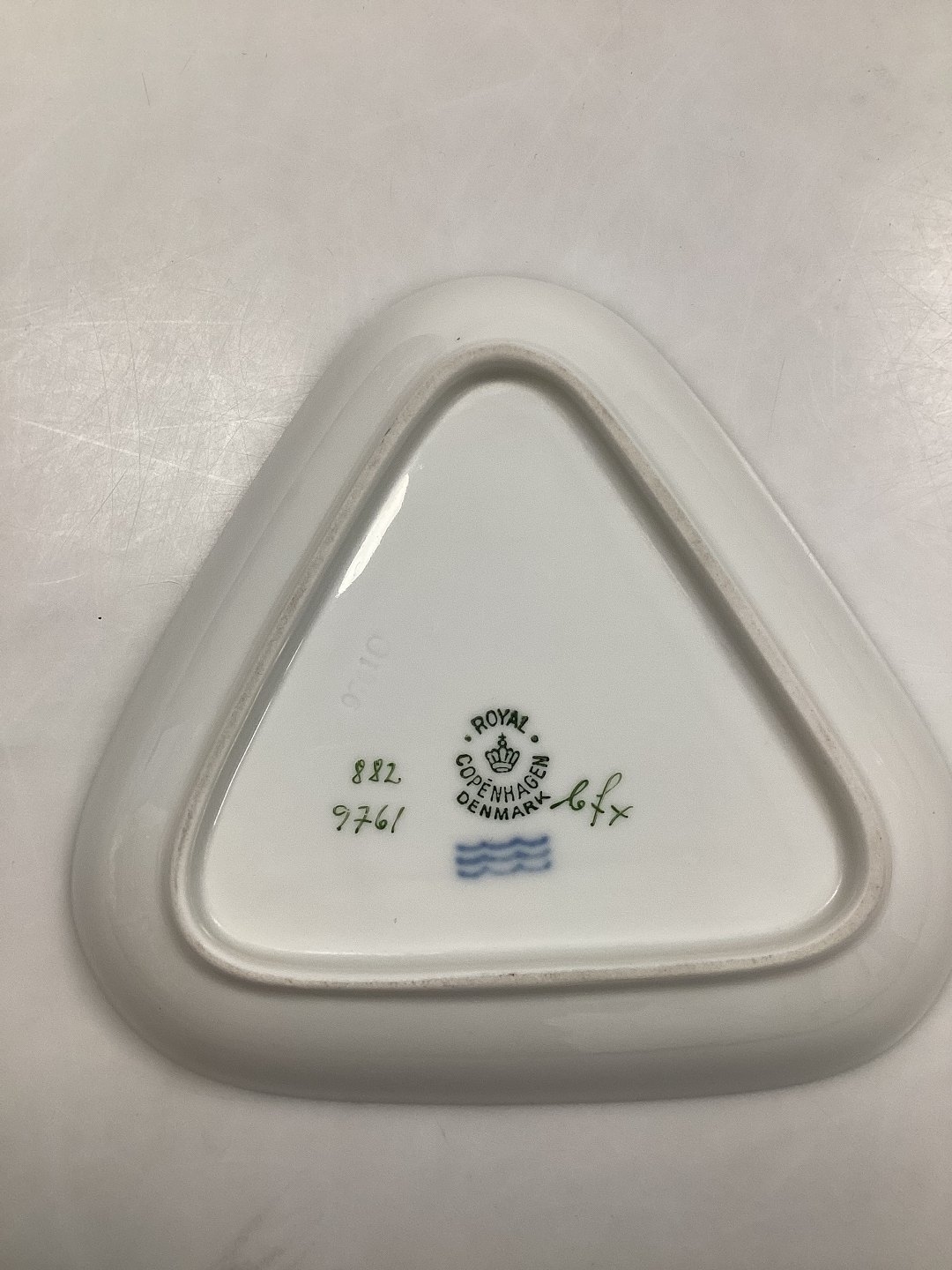 Royal Copenhagen Dybbøl Condiment Set No. 9761/9760/9798/9759. Set consisting of triangular tray, salt and pepper shakers and mustard jar.