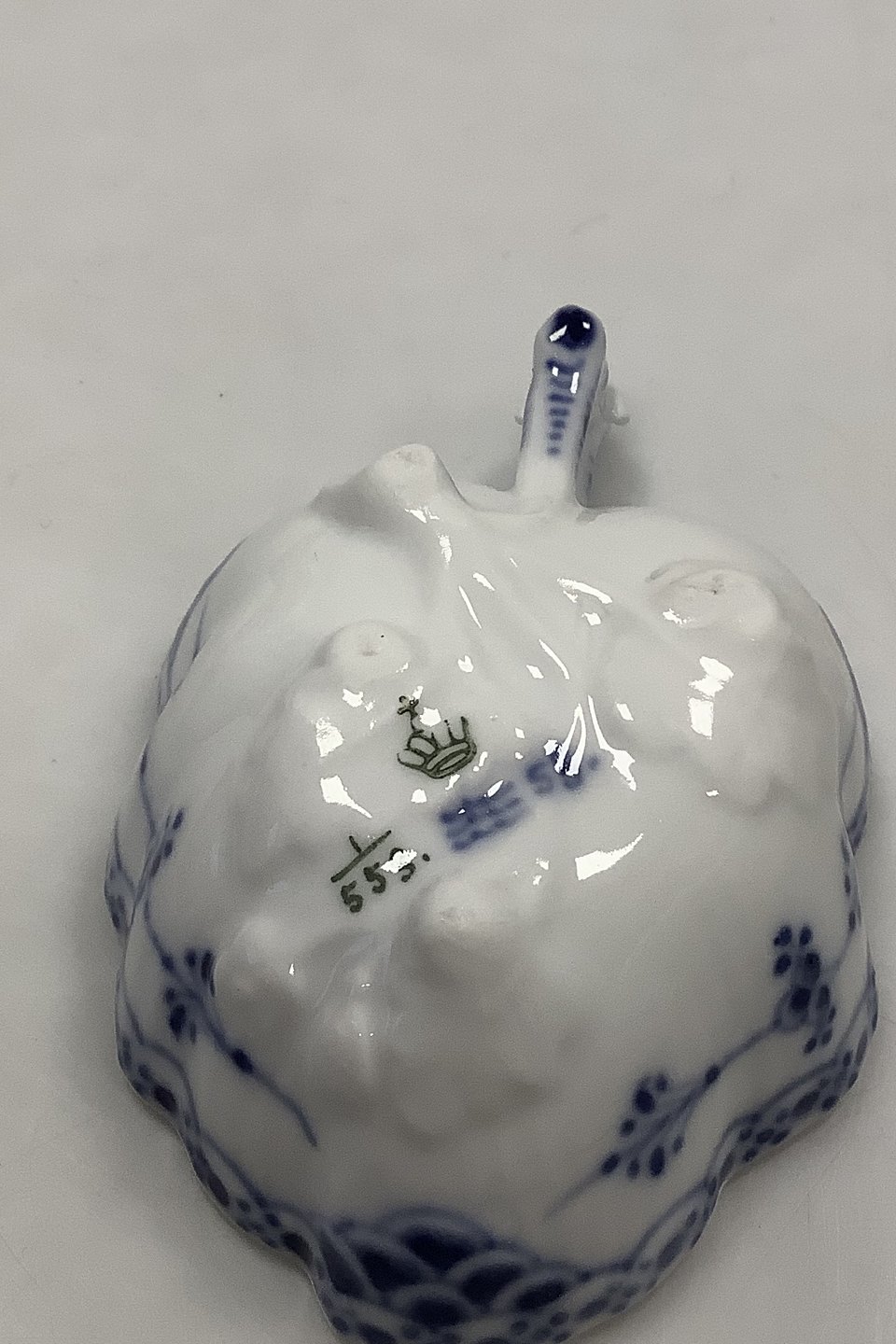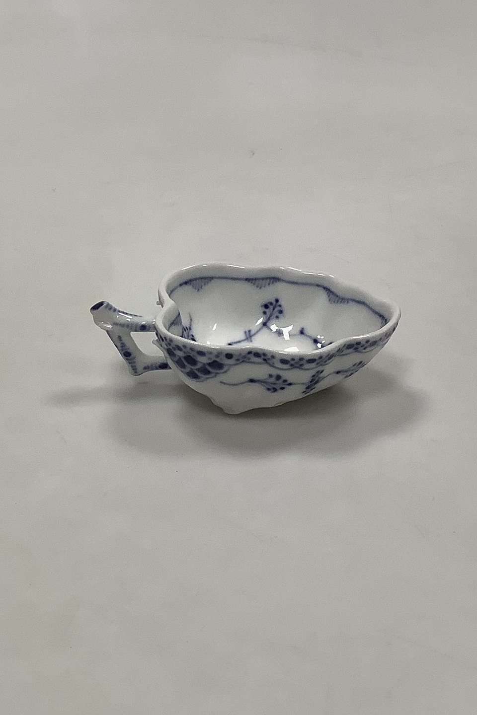 Royal Copenhagen Musselmalet Halvblonde Lille bladformet skål No 553. Måler 10 cm. Afslag på hank