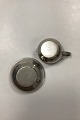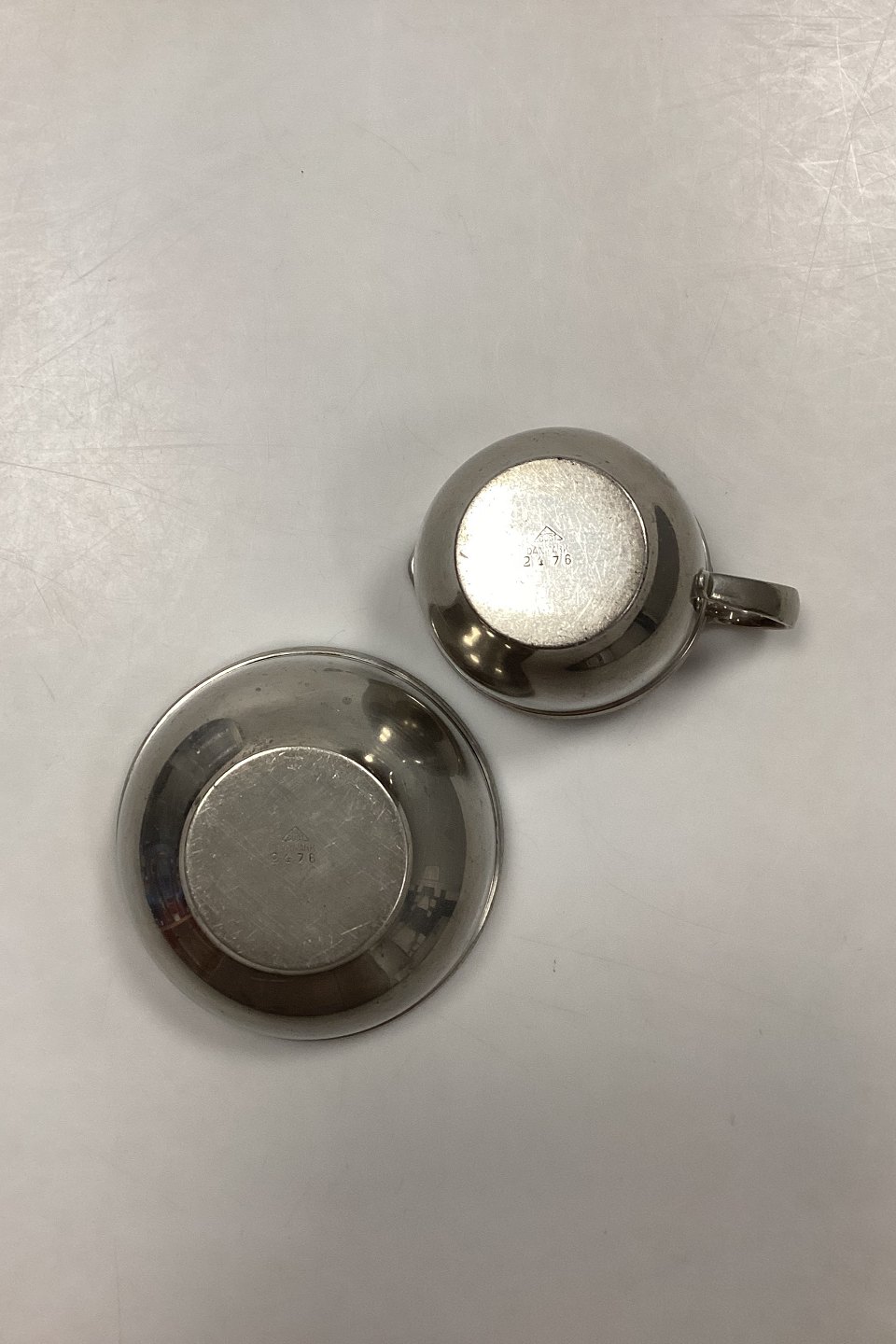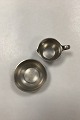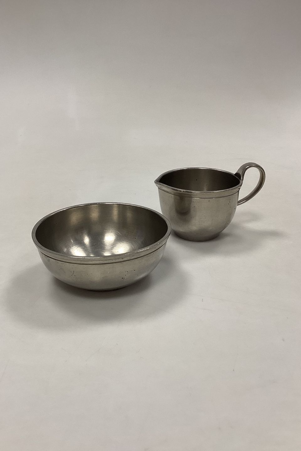Just Andersen Tin Flødekande og Sukkerskål No. 2476. Skålen måler 10,3 cm x 4,3 cm / 4.06 in. x 1.7 in. Kanden måler med hank 10,3 cm x 5,4 cm / 4.06 in. x 2.13 in.
