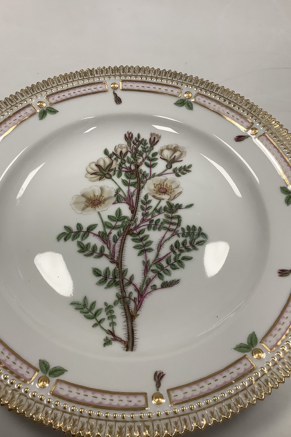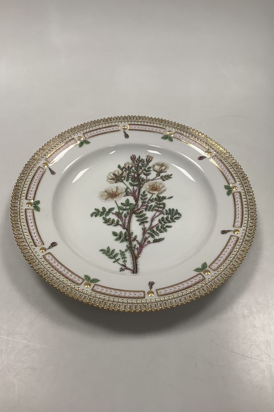 Royal Copenhagen Flora Danica Spisetallerken No. 624 (20/3549) Måler Diam 26 cm. (10.23 inch) 1. Sortering. Latinsk Navn: Rosa impinelleafolia L.
