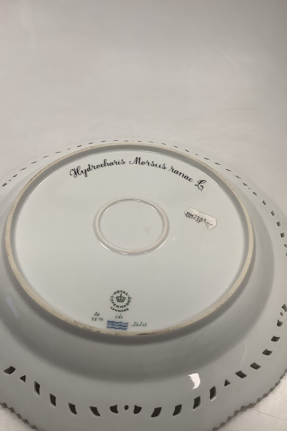 Royal Copenhagen Flora Danica Charger plate with pierced border No 20 / 3574 or 381. Measures 28 cm / 11 1/32 in. Latin name: Hydrochaus Morsus ranae L