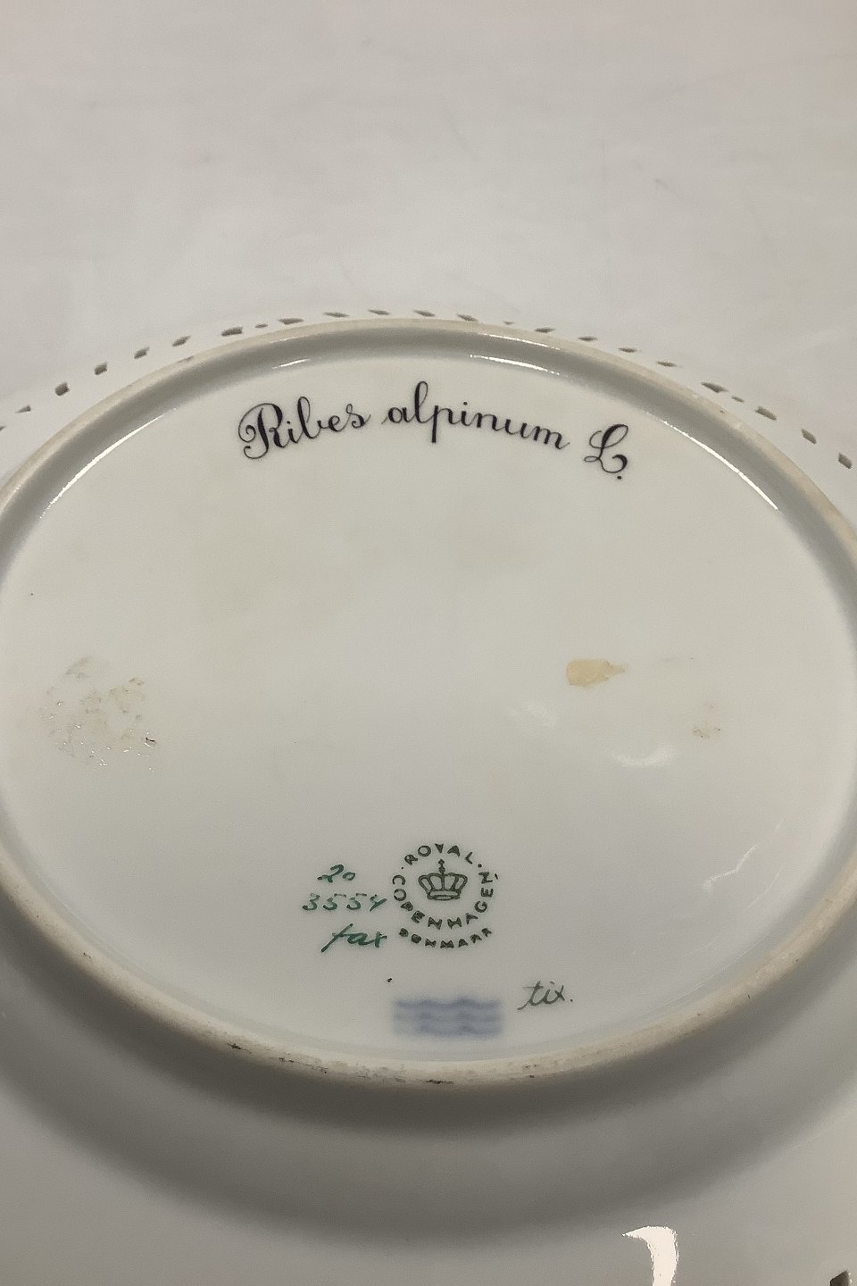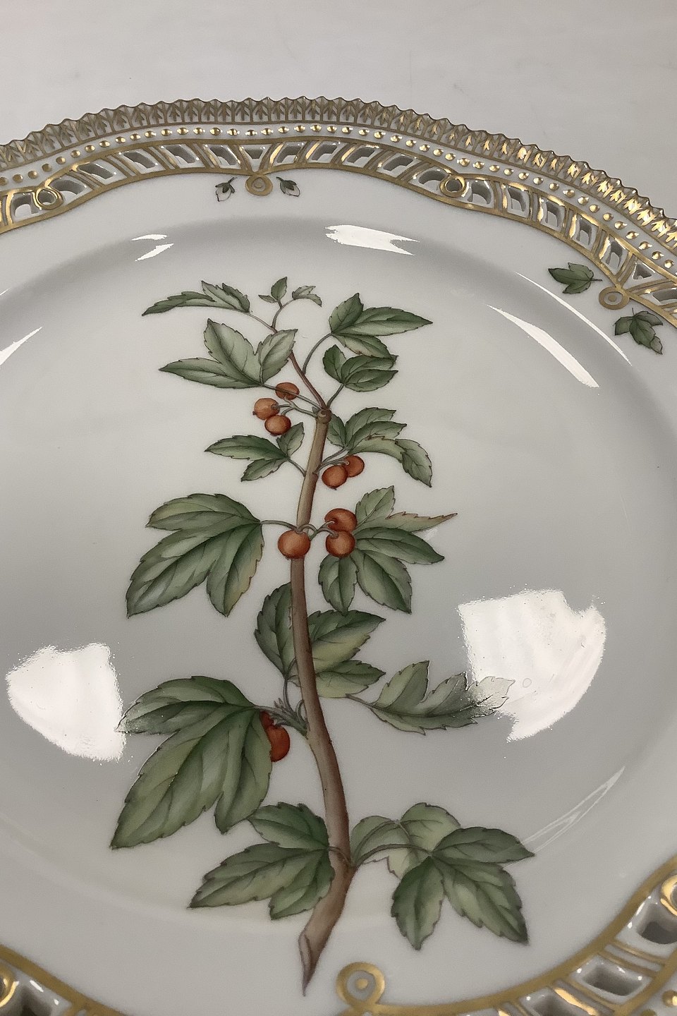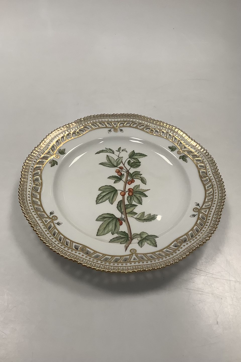 Royal Copenhagen Flora Danica Frokosttallerken No 20 / 3554 med gennembrudt kant. Latinsk Navn: Rubes alpinum L
