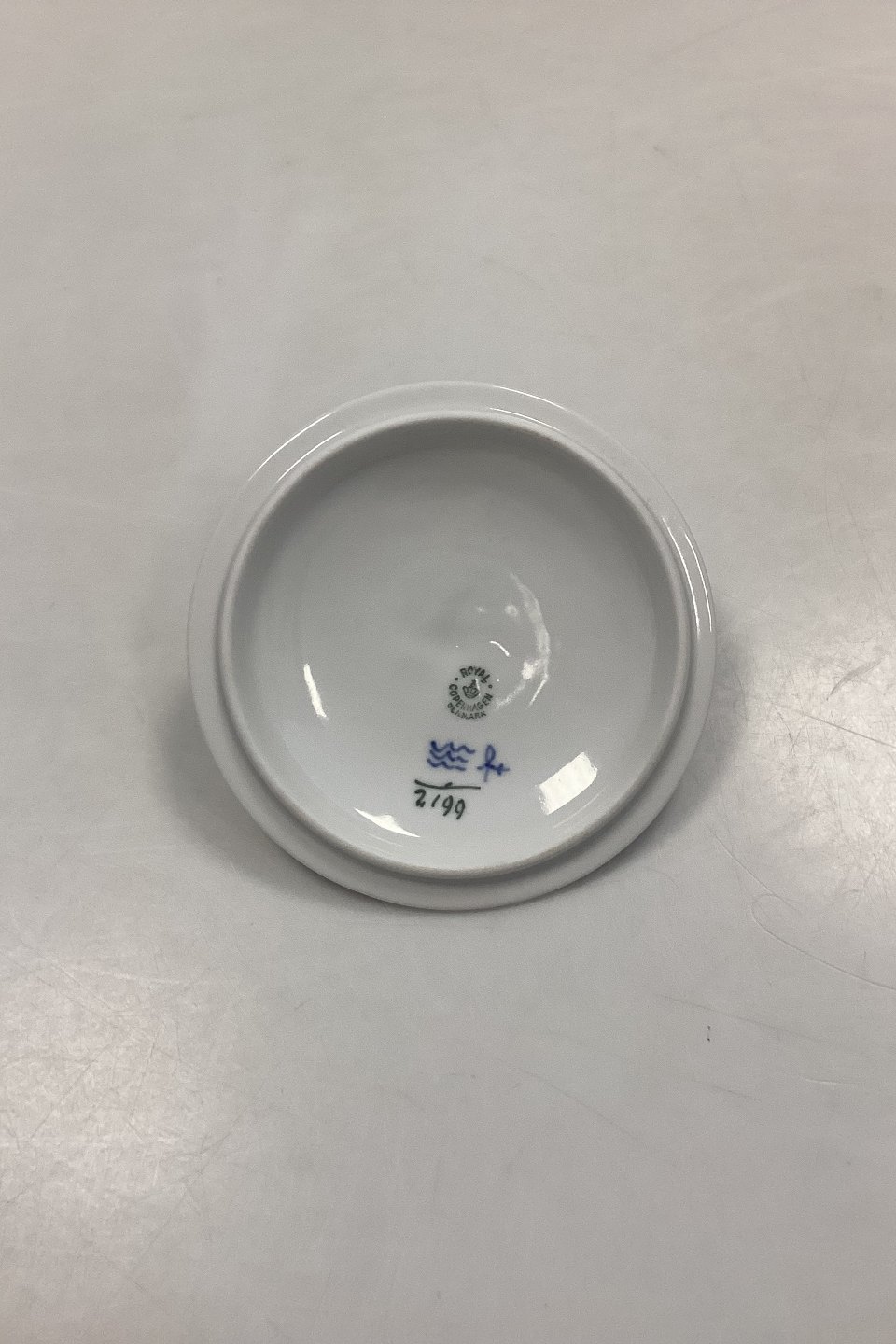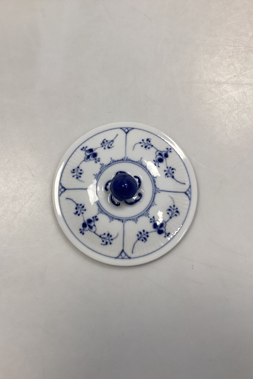 Royal Copenhagen Musselmalet Riflet Låg til Bouillonkop No. 2199. Måler 12 cm / 4.73 in. i diameter.
