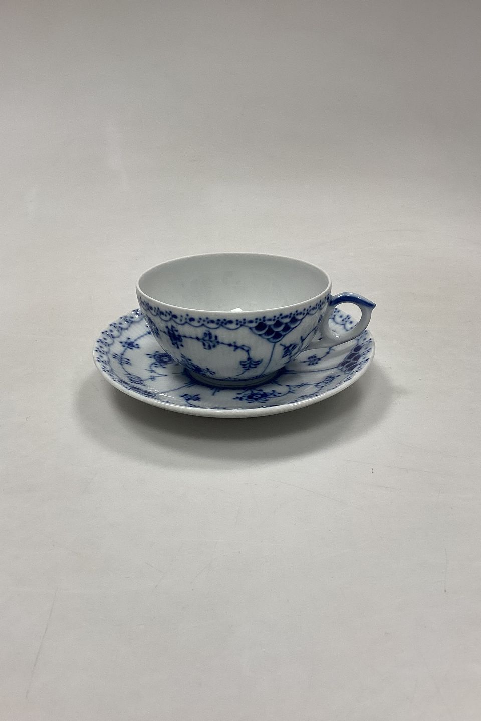 Royal Copenhagen Blue Fluted Half Lace Tea Cup and Saucer No. 525/081. Cup measures 4,5 x 10 cm / 1.77 in. x 3.93 in. 3rd Quality