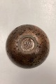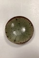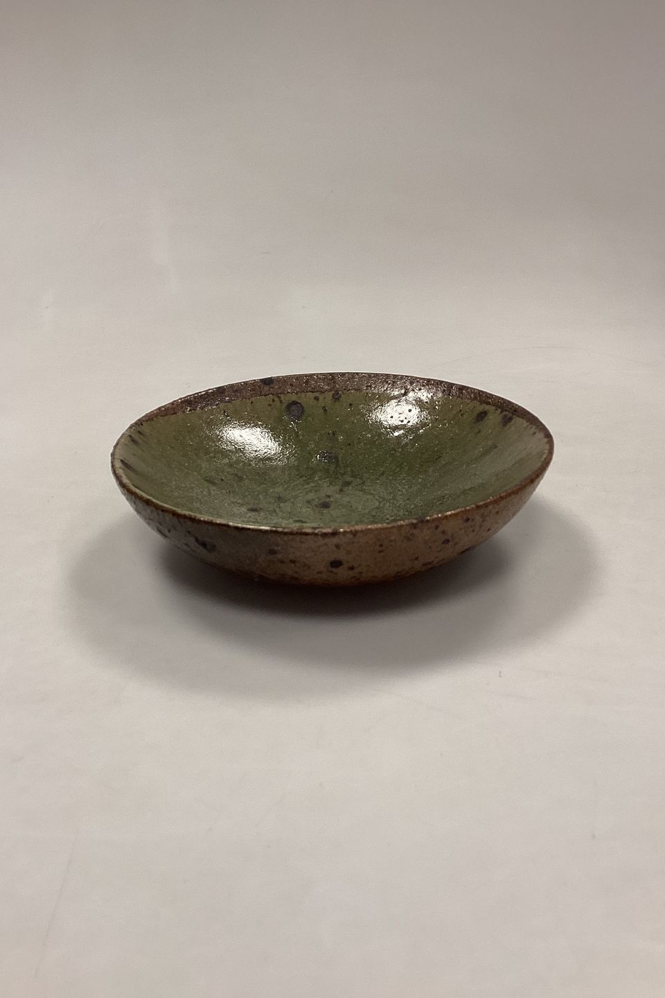 Olivengrøn Stentøjsskål. Glat glasur indvendig. Ru brunlig glasur udvendig. Kunstner ukendt.